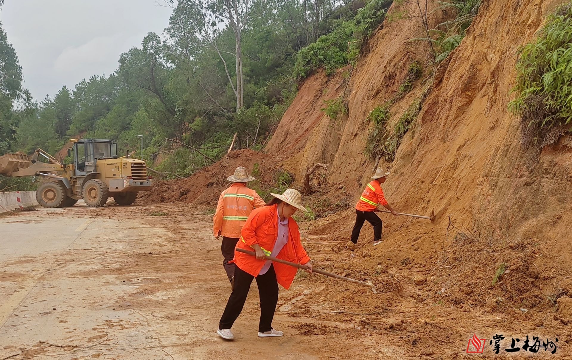 在省道S239线双华镇虎石村路段,五华县交通运输服务中心组织铲车、养护人员,正加紧清理道路边坡滑塌下来的泥土、树枝等杂物。经过及时抢通作业,现场已恢复单边通行,并有工作人员驻守指挥交通,保障过往车辆和人员安全。