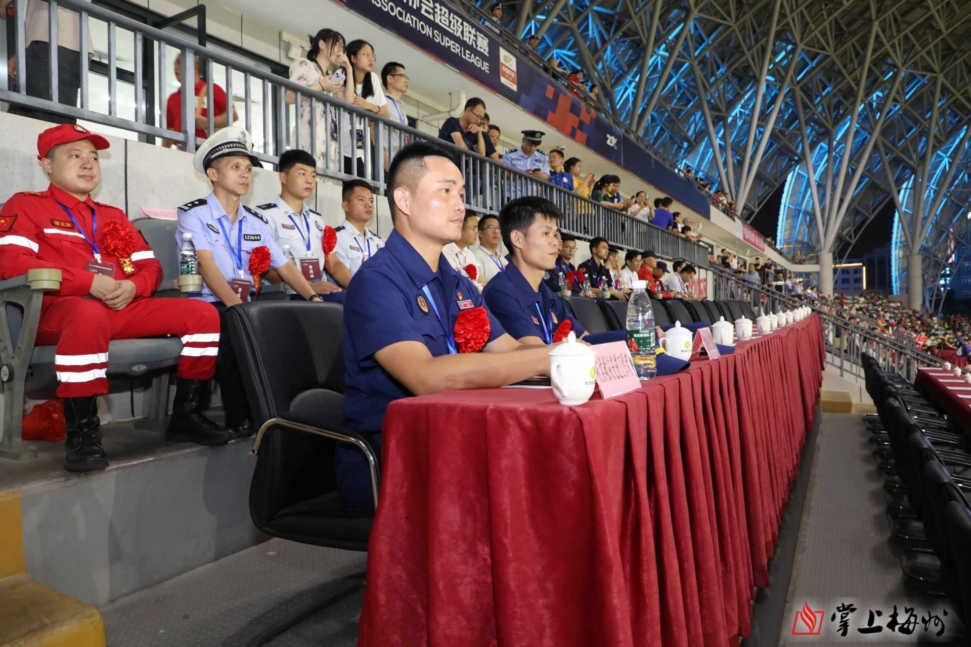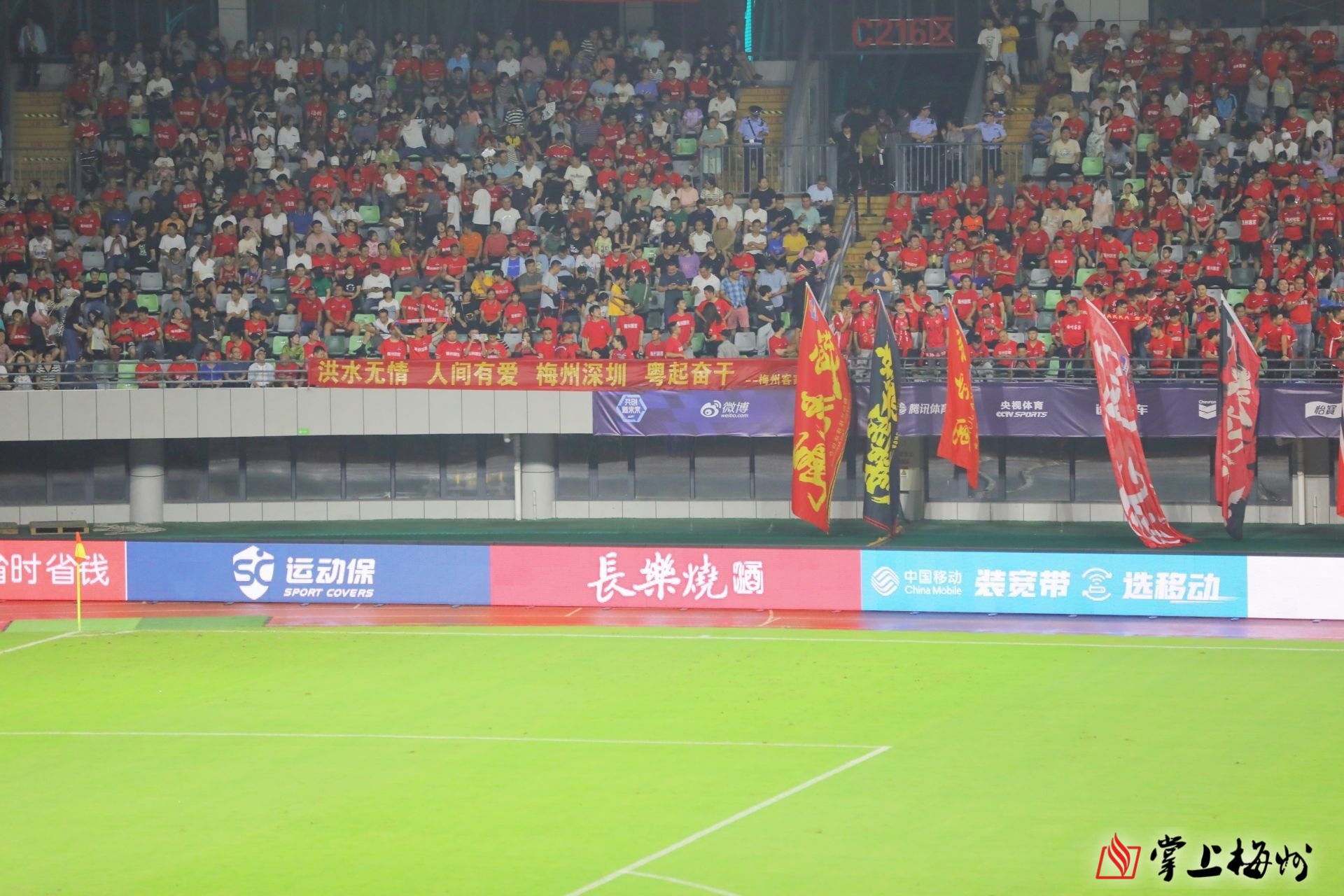 掌上梅州讯 9月16日晚,梅州客家队坐镇惠堂体育场迎战深圳队,除大批球迷到场看球外,现场还邀请部分抗洪抢险勇士看球,五华中超之夜热闹又温暖。