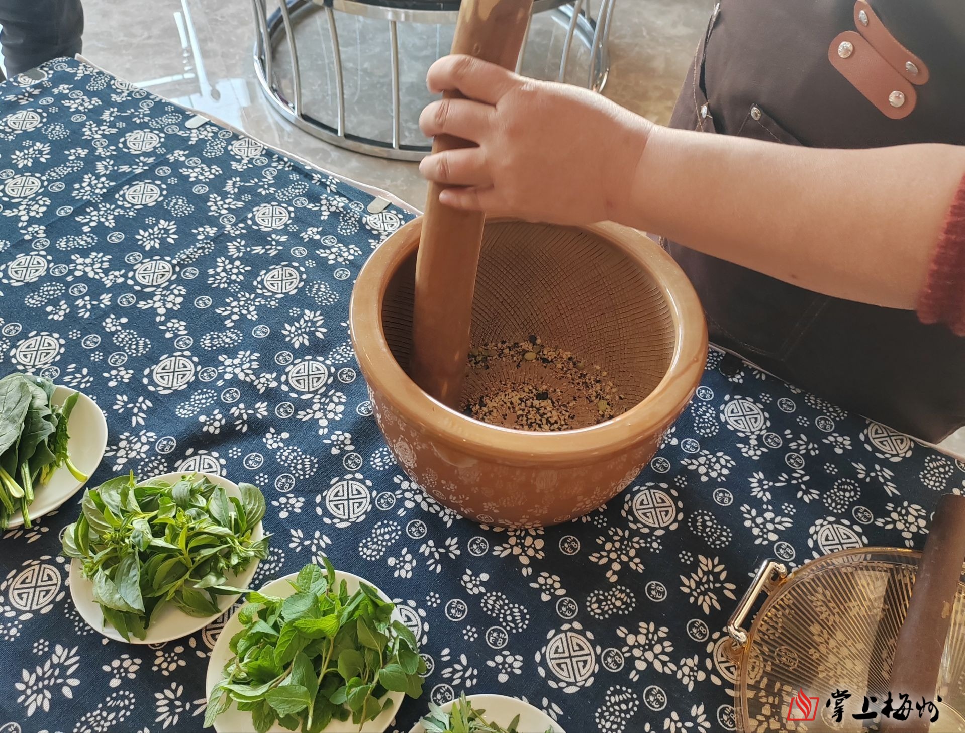 活动现场,擂茶制作能手手握擂杵,在擂钵中依次加入茶叶、炒香的花生和芝麻,以及薄荷叶等多种擂茶制作原料认真研磨。经过一段时间的细细研磨,随着沸水的加入,一股擂茶特有的醇香瞬间飘散开来,让人垂涎欲滴,嘉宾们纷纷争相品尝和体验擂茶制作乐趣,现场热闹非凡。