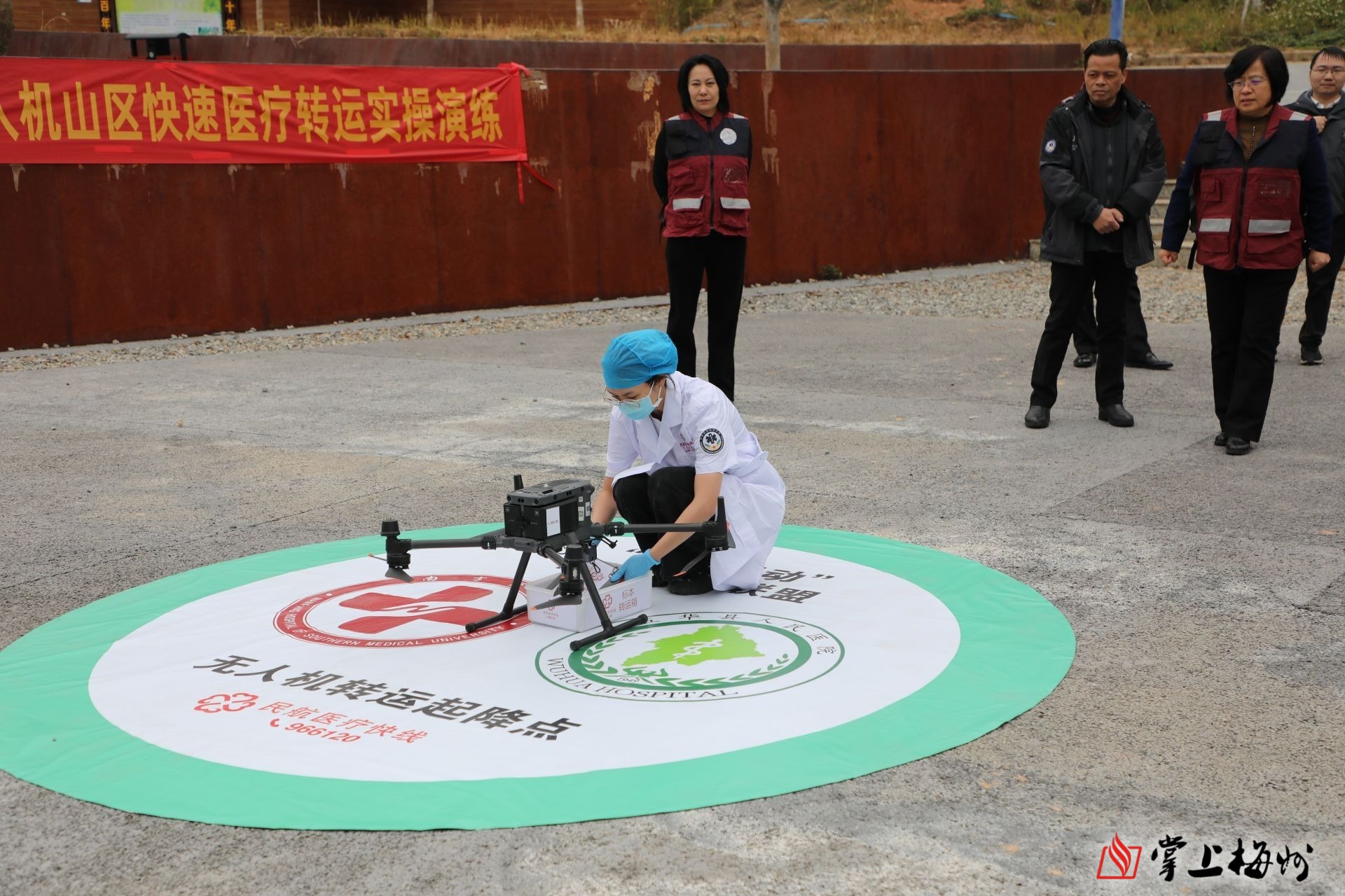 此外,南方医院还在河东镇政府广场开展了“健康圩场”健康咨询活动,在天云岭森林公园开展“陆空协同”低空无人机山区快速医疗转运实操演练,模拟山区环境快速运送检验标本,进一步提升五华县医疗应急救援能力与效率。