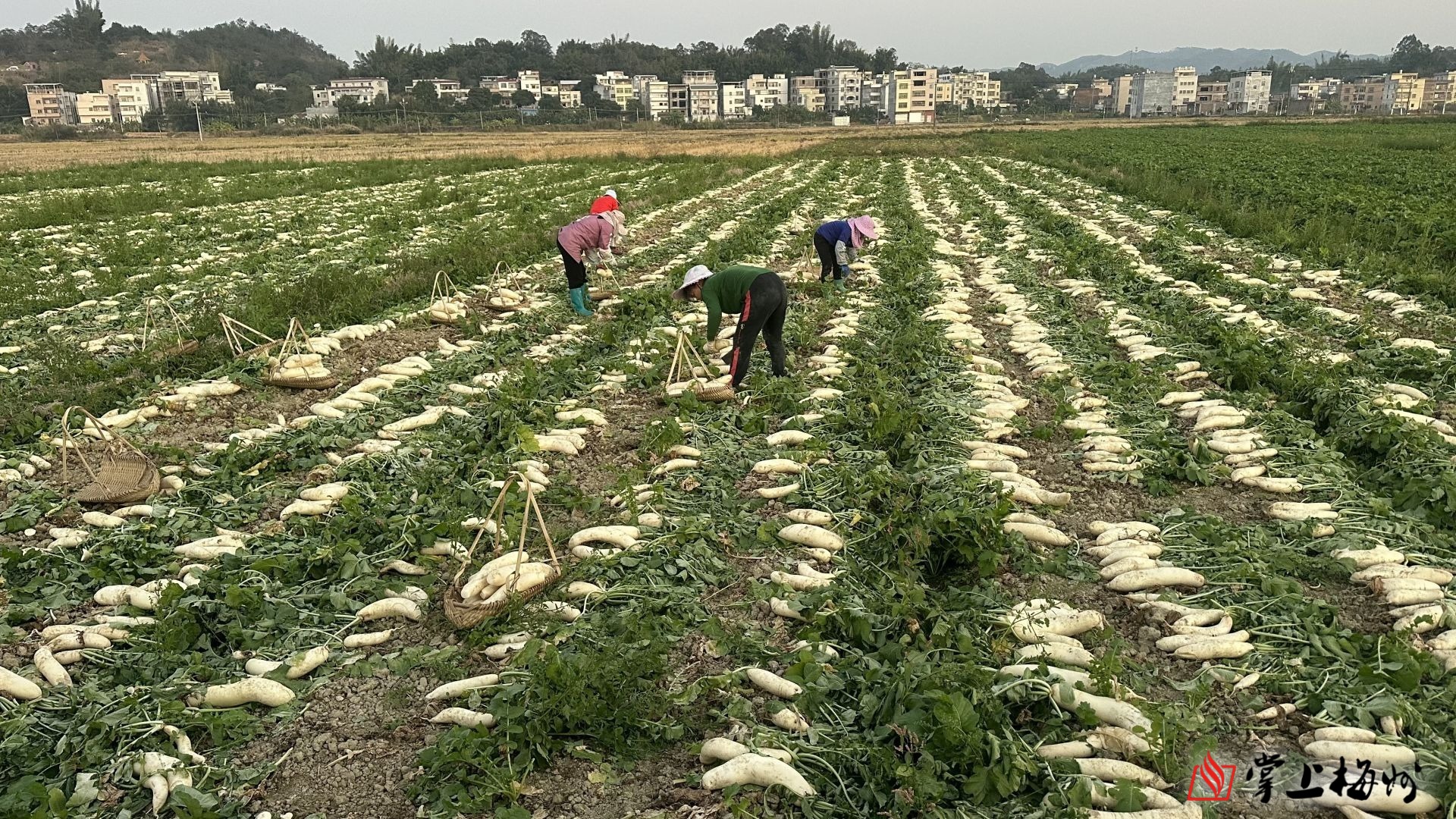 掌上梅州讯 冬闲变冬忙,绘就好”丰景”。眼下,正是冬种萝卜的采收时节。在五华县梅林镇梅东村,五华县日日升种植专业合作社种植的150亩白萝卜近日喜迎丰收,农户正抢抓农时采收萝卜、晒制菜脯,红红火火的特色种植业为当地村民带来了致富新途径。