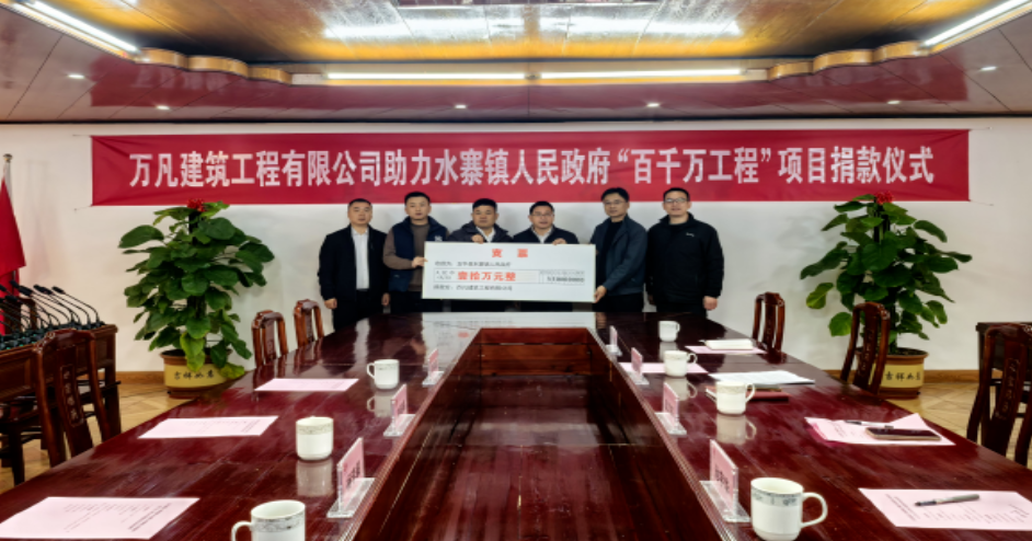 仪式上,万凡建筑工程有限公司慷慨解囊,向水寨镇捐款10万元,全力支持农房风貌提升、人居环境品质提升、城镇基础设施项目建设,推进水寨镇“百千万工程”走深走实。