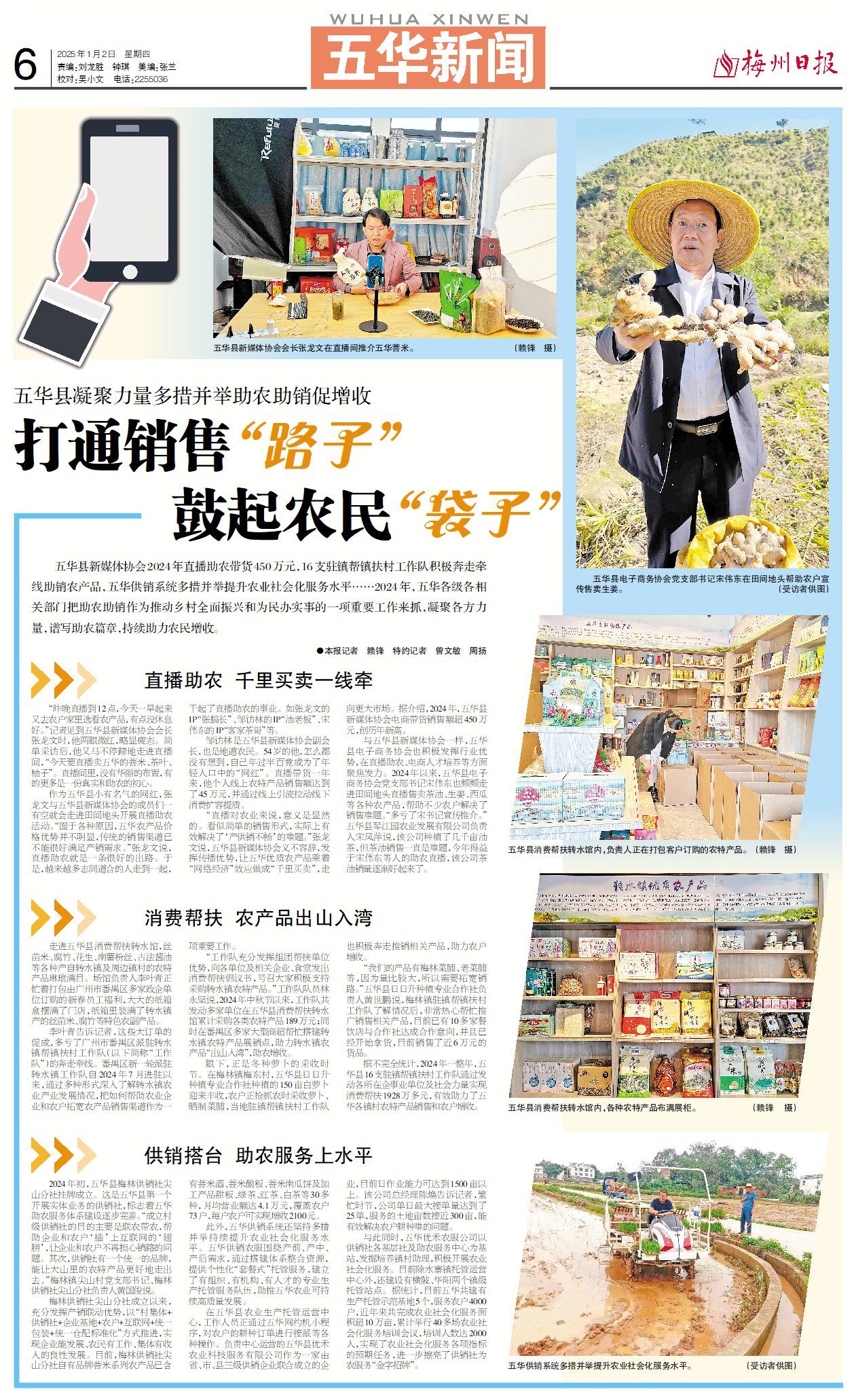 五华县新媒体协会2024年直播助农带货450万元,16支驻镇帮镇扶村工作队积极奔走牵线助销农产品,五华供销系统多措并举提升农业社会化服务水平……2024年,五华各级各相关部门把助农助销作为推动乡村全面振兴和为民办实事的一项重要工作来抓,凝聚各方力量,谱写助农篇章,持续助力农民增收。