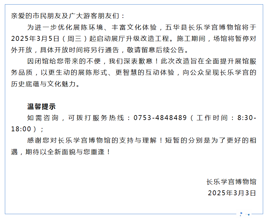 五华县长乐学宫3月5日起闭馆升级,具体开放时间将另行通告