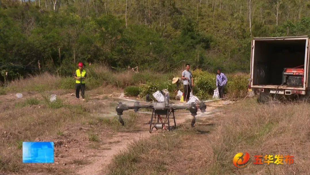 近日,记者在河东镇油田村施工造林点看到,工作人员正操作无人机吊着树苗在山顶与山脚间来回盘旋穿梭,将树苗精准“空投”到种植点,大大缩减人工用工时间,在造林模式上实现了新的飞跃,全力加快推进造林进度。
