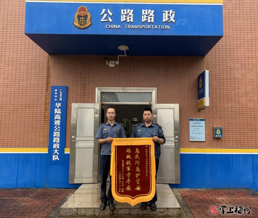 掌上梅州讯 5月29日,广东省交通集团所属华陆高速路政中队收到了一份远道而来的包裹——一面来自山东超越棉纺有限公司寄出的“急民所需护货安路政铁军守平安”锦旗,在这面熠熠生辉的锦旗背后是一段路政暖心救助、力挽损失的感人佳话。