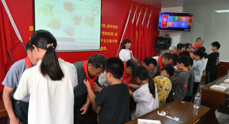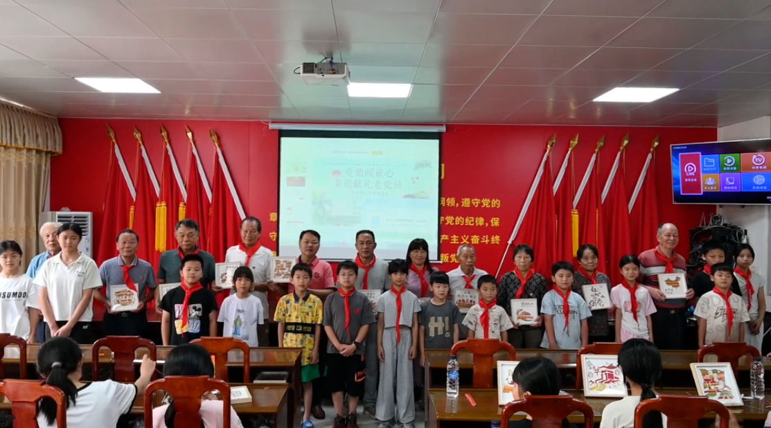 学生环节温馨感人,少先队员们用为党员佩戴红领巾,并送上各自制作的非遗竹编作品,最朴素的方式表达对老党员的崇高敬意。活动最后,全体人员起立,齐声唱响《没有共产党就没有新中国》,激昂的歌声将现场气氛推向高潮。