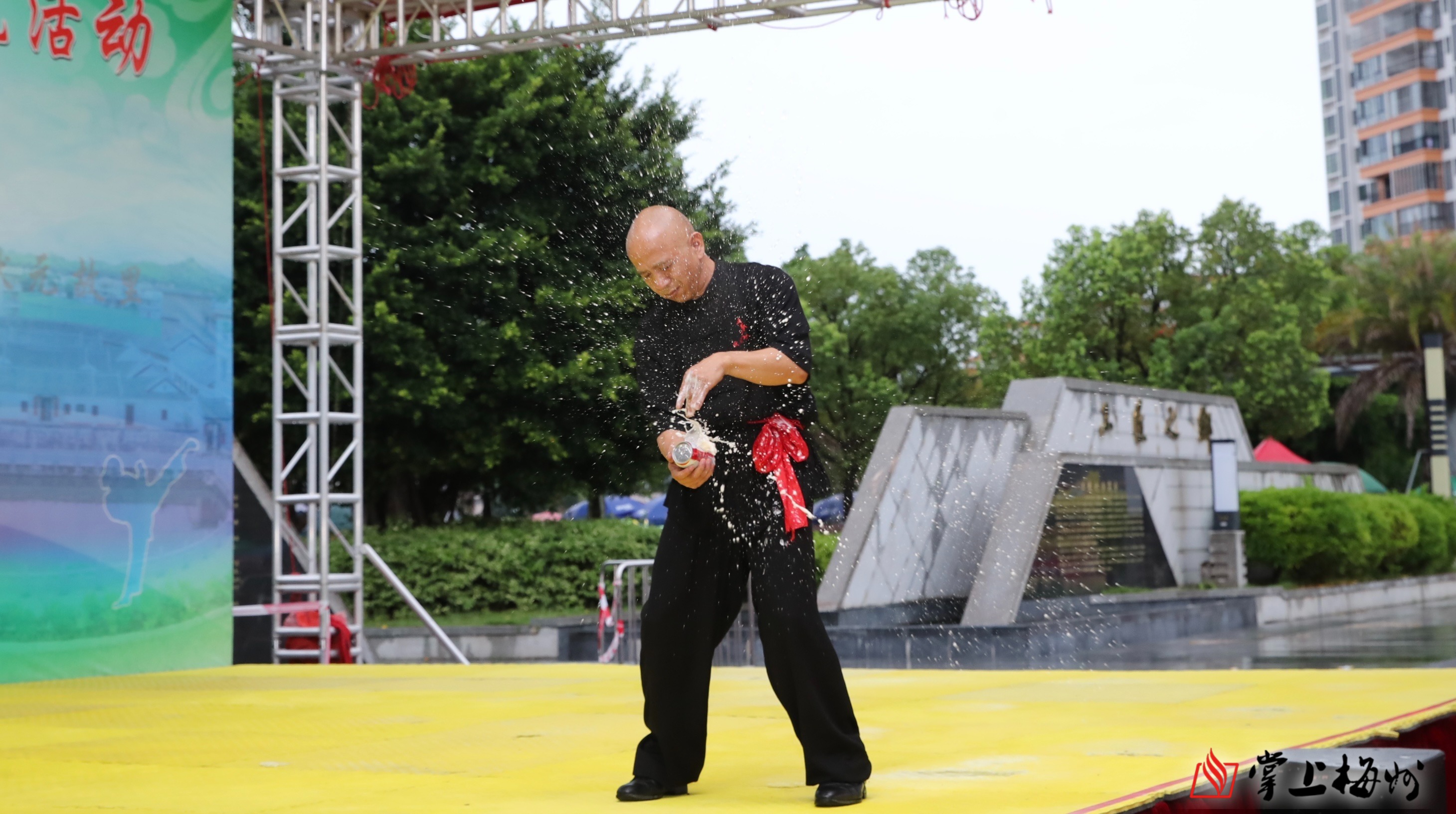 状元耙头功、武当剑、九节鞭、洪拳佛掌、蝴蝶双剑、棍术……活动现场,58个精彩节目轮番登场,涵盖拳术、兵械、特色绝技等多个类别。五华本地武术团队带来的《状元武韵》拉开序幕,一招一式尽显“状元功夫”的刚柔并济;《状元耙头功》《状元棍法》等特色项目,更是将本土武术的独特技法展现得淋漓尽致。香港团队的螳螂伞灵动飘逸,深圳团队的武术展示刚劲有力,梅州各县区的廖氏内家拳、颜家教、李家拳等传统拳种轮番亮相,让观众近距离感受不同武术流派的魅力,现场掌声与喝彩声不绝于耳。