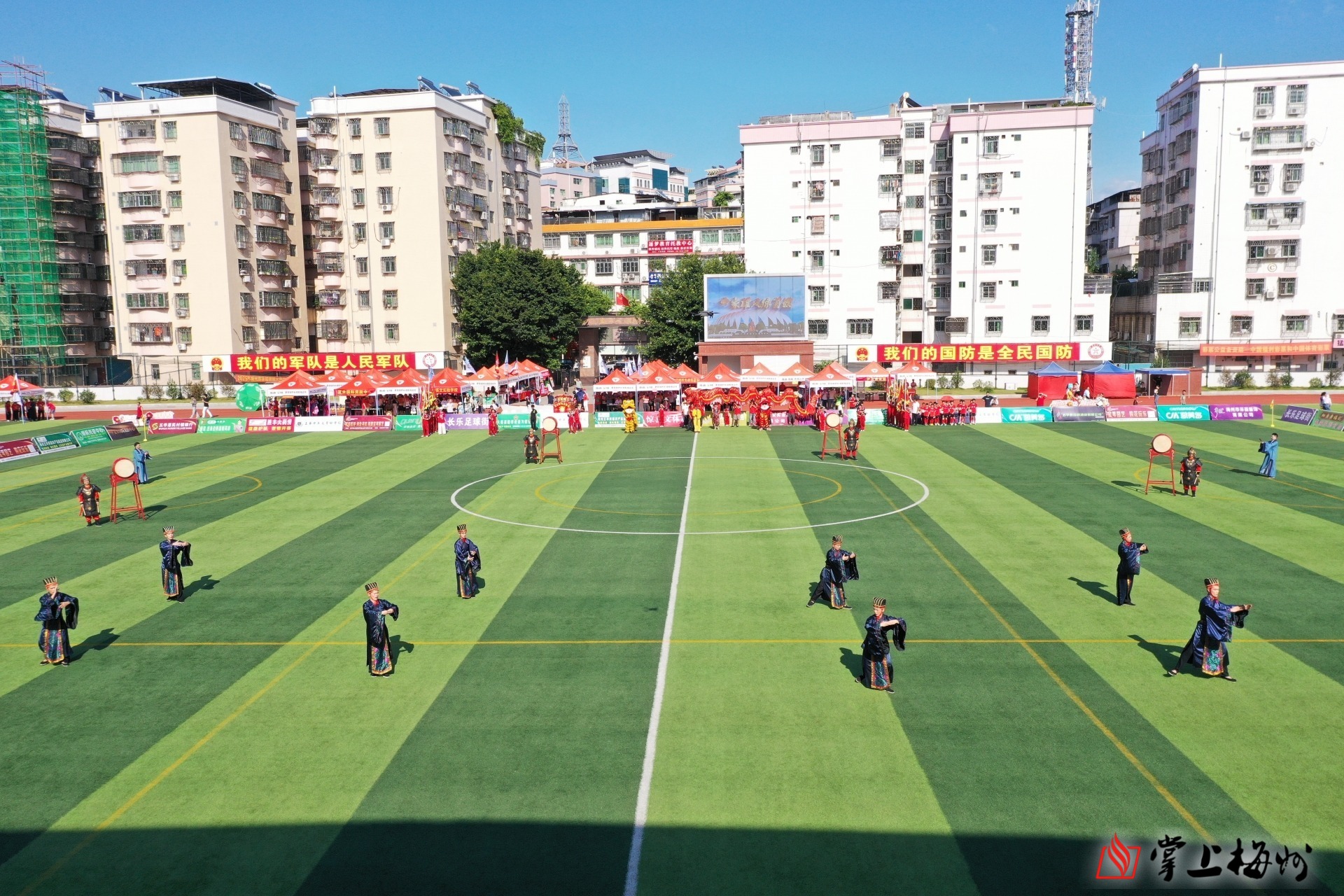开幕式以一场“穿越”千年的文化展演拉开帷幕,将五华“文武交辉”的底蕴展现得淋漓尽致。雄浑鼓声中,《秦汉雄风》场景重现,再现公元前196年汉使陆贾南下、赵佗受封促进岭南中原文明交融的历史;六名长衫男子手执纸扇,吟诵苏轼《定风波》,尽显“诗词之乡”的千年诗心;威武少年的武术表演,回溯清朝乾隆年间李威光钦点武状元的荣光,传递自强精神;球员们活力十足的颠球炫技,串联起1873年长布元坑播下中国内地现代足球第一粒种子、李惠堂从柚子树下走向世界的足球记忆。最后,提线木偶与采茶戏组成的非遗表演登场,提线木偶牵引文化命脉、矮子步丈量百姓情怀、舞龙尽显文武双全、锣花承载美好夙愿,让非遗灵魂与足球激情碰撞交融。