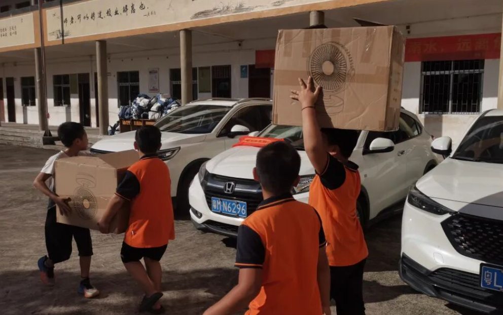 打开这份“情意礼包”,从装书的书包、遮雨的安心伞,到日常用的保温杯、洗手液,再到学习必备的笔记本、文具套装,甚至贴心准备了电风扇、儿童牙具和急救包——1460件物资塞满57个箱子,每一样都精准戳中孩子们的需求。活动现场,工作队员和志愿者顶着炎热穿梭搬运,仔细将物资分装成一个个整齐的书包,忙碌的身影成了校园里最动人的风景。