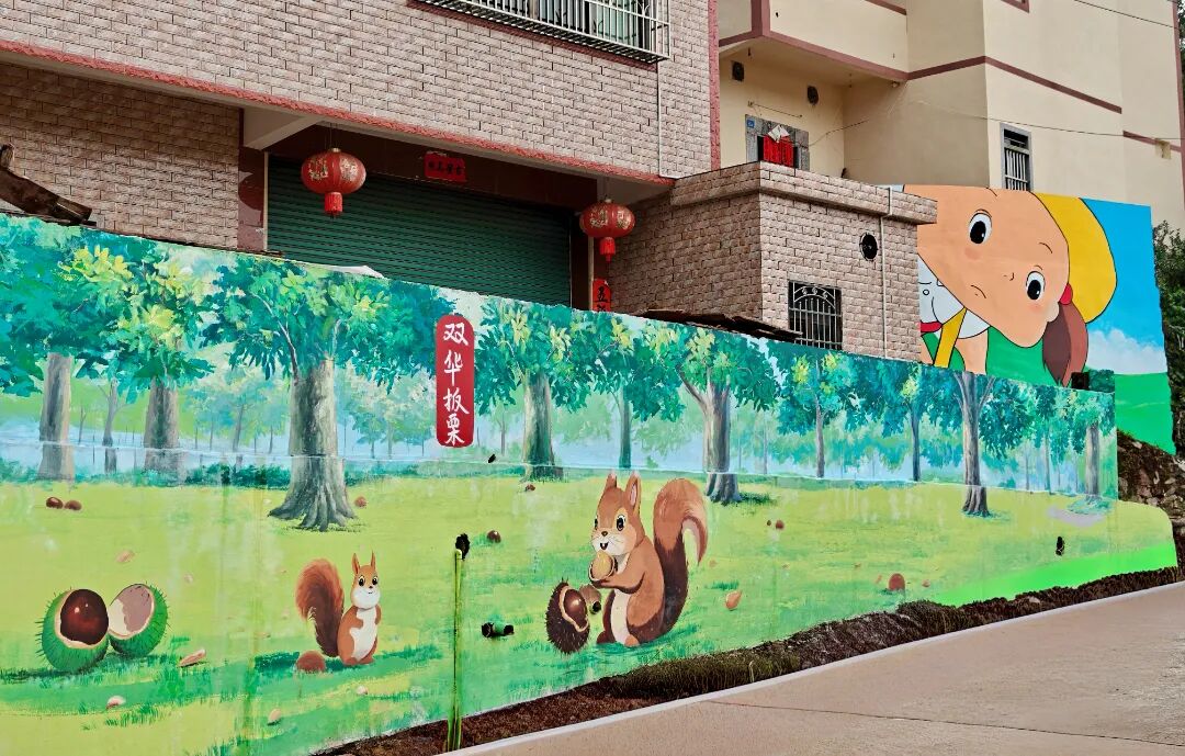 墙绘里的每一笔,都藏着双华的“产业故事”:三华李是双华的“金果子”,七村连片种植三华李,万亩李园每年可为群众户均增收上万元;板栗是“土宝贝”,五村联动种植板栗,每逢板栗丰收季,正宗的双华板栗,尤其是竹山板栗,可谓是“有价无市”。现在,这些“双华宝贝”变成了“卡通明星”,跃然墙面变成了双的“文化符号”。