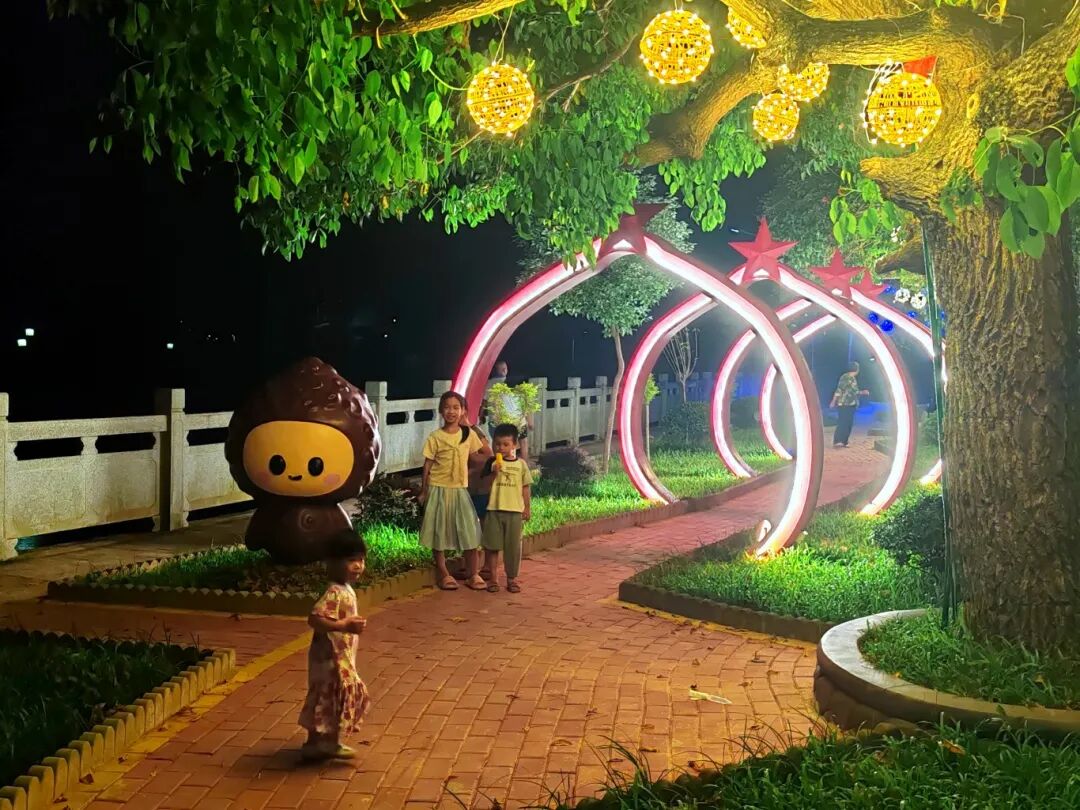 “看!李果妹妹和板栗阿哥在拉手!”五华县双华镇卫生院大楼墙根下,小朋友踮着脚拽妈妈衣角,手指戳向墙面——墙绘里,李果妹妹梳双马尾、戴李花、穿红上衣蓝布裙,板栗阿哥身着粗布衫,两人手拉手漫步果园,风里都飘着三华李的甜香和板栗的清醇。