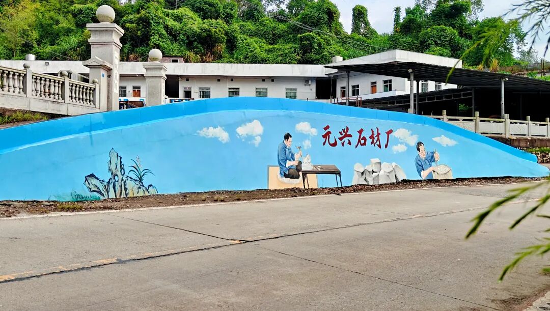 进双华的大路边,石业的“坚韧”先撞入视线—— 一段蓝色弧形围墙像块“产业招牌”:墙面画着两个穿蓝布衫的工人,一个蹲在桌前挥锤凿石,火星子似要蹦出画外;一个握着刻刀修磨石材,指节泛着劲。旁边堆着刚切割的方石,上方“元兴石材厂”的红色标语格外醒目。这抹“石色”,正是双华的支柱产业缩影——石业伴随双华人数百年,从石板加工到石材雕刻,成了乡亲们的“钱袋子”,硬汉双手雕顽石,北京天安门广场的石建工程、广州解放纪念雕像、越秀五羊雕像都有双华石匠的身影。