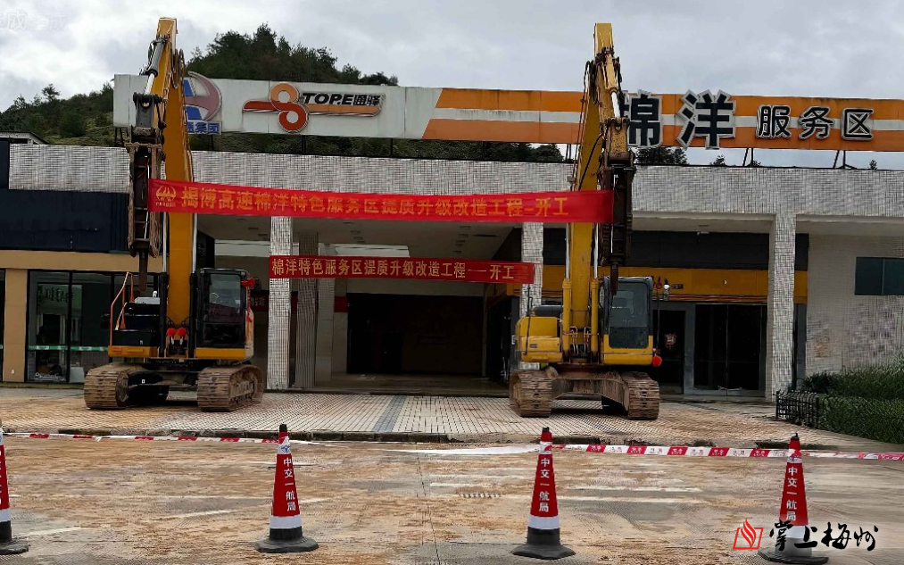 掌上梅州讯 10月13日上午11时,随着两台挖掘机伸展机械臂对服务区建筑进行拆除作业,广东交通集团所属揭博高速棉洋服务区提质升级改造工程正式开工。