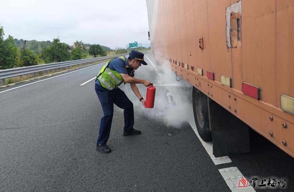 10月16日上午8时43分,路政员黄雄业与搭档在巡查至往梅州方向大平山隧道附近路段时,发现一辆重型半挂快递运输车左后轮冒烟,停靠在应急车道上,若处置不及时易引发事故。两人采取安全围蔽措施,引导后方车辆减速避让,保护现场安全。同时,黄雄业取出随车配备的灭火器,对准故障大货车左后轮,进行灭火、降温作业,将车辆着火隐患彻底排除。