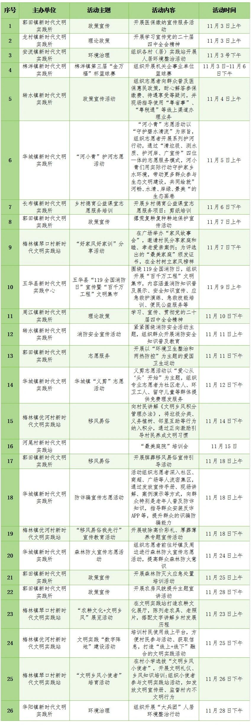 速看!五华县11月新时代文明实践活动计划表→ 2025-11-02 20:23 五华县文明办 3 共绘文明画卷,同赴美好时光!为推动新时代文明实践内涵式发展,积极培育和践行社会主义核心价值观,五华县新时代文明实践中心(所、站)将在11月开展形式各样、内容丰富的文明实践活动。现将部分活动预告如下,总有一款适合您! 编辑:张晓珊 审核:张英昊