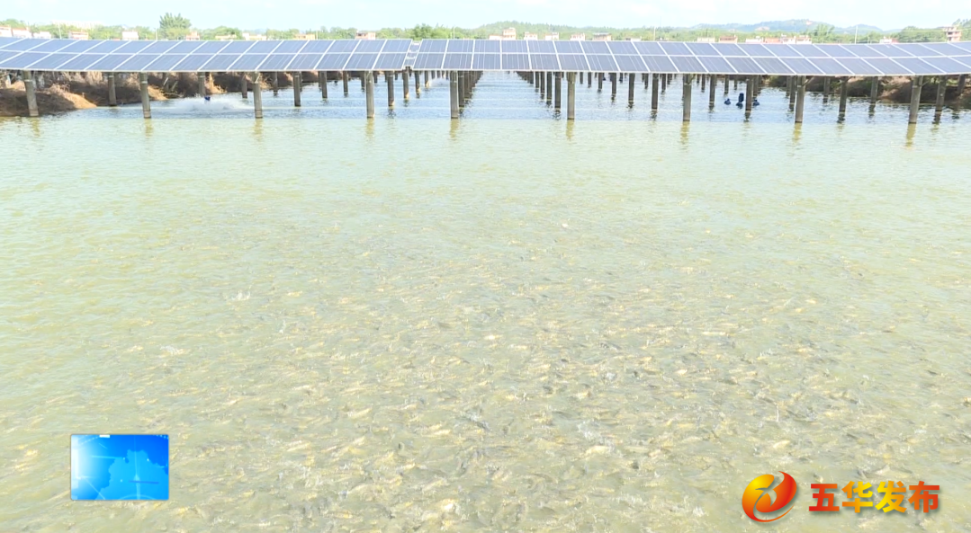 【五华县金河农业发展有限公司负责人 张德纯:基地总占地面积114.08亩,渔场是有9个鱼塘,约90亩,所有的鱼加起来现在大概有100万斤,光伏大约是70亩,每天发电2万度左右,光伏产生的效益按年来算的话是300万元左右,塘边还种了辣木树、桑树,用来喂鱼。】
