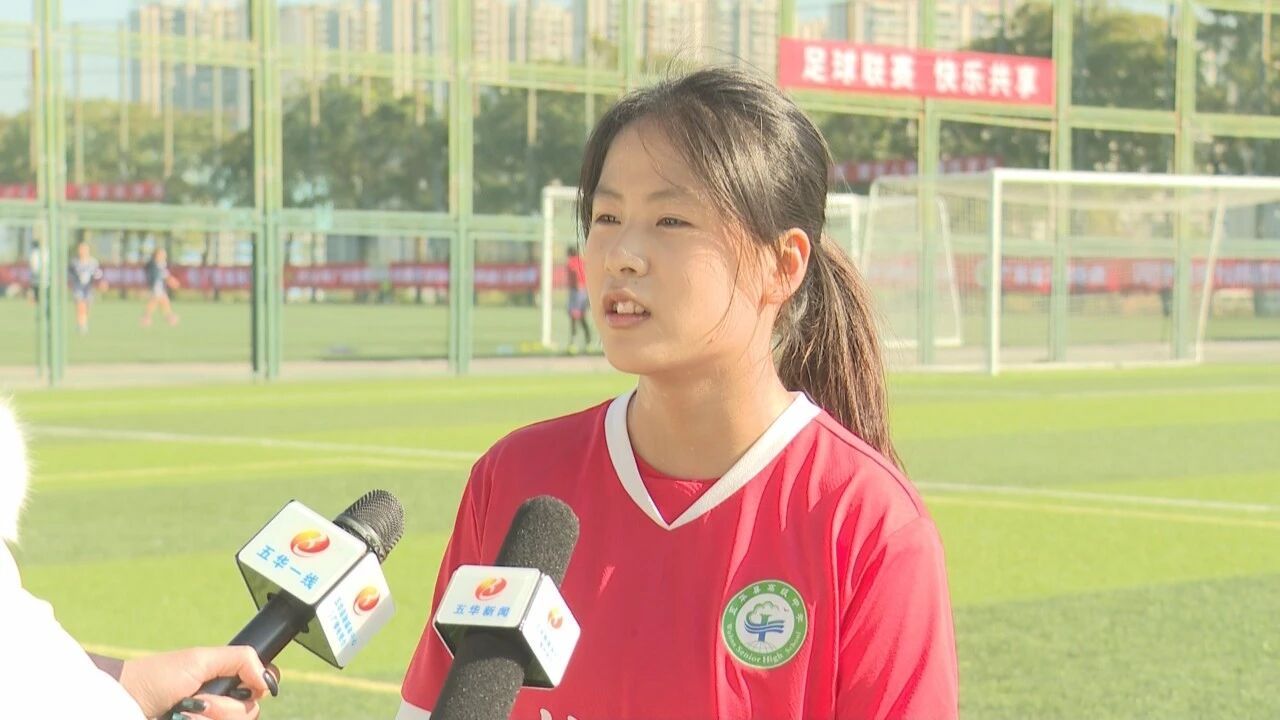【五华县高级中学女子足球队队员 高慧琳:这是我第二次参加这个比赛了,高一的时候也参加过一次省联赛。(相较而言)第一次会比较紧张,第二次的话,由于后期也踢了蛮多场比赛了,就没那么紧张,也会相较没那么害怕了。(目标是)想拿冠军。】