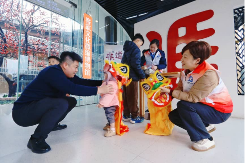 而在活动现场,孩子们头戴狮头、身披红尾,在志愿者的悉心指导下化身“小小舞狮手”,迈着稚嫩步伐模仿舞狮姿态,沉浸式解锁非遗乐趣。“小弟弟,你猜一下,这几张图片哪张才是五华木偶戏呀?”“酿豆腐、长乐烧哪个才是省级非遗文化呢?”趣味问答、互动体验,让客家文化在欢声笑语中悄然传承。这场寓教于乐的文化互动,不仅使得赶路时光变的充实有趣,更让非遗在旅途间隙实现润物无声的传承。