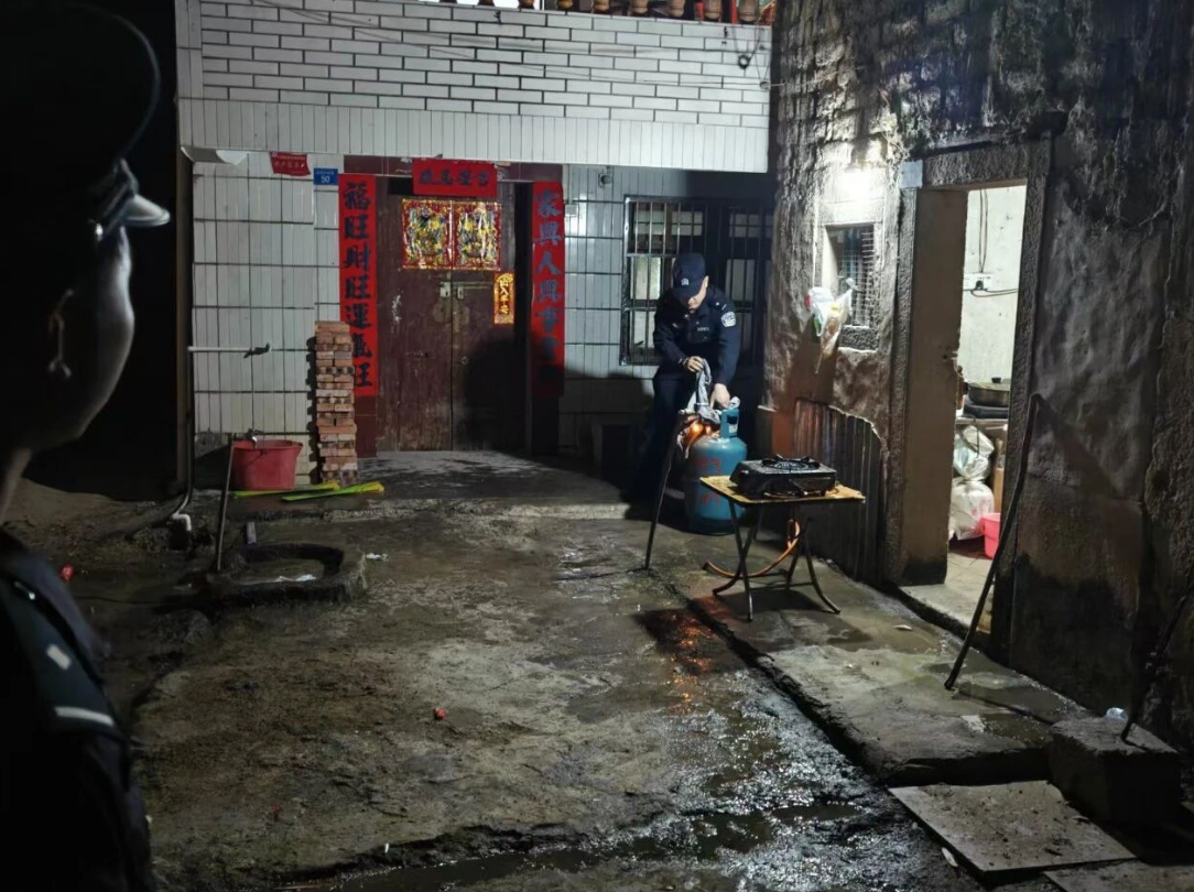 2月16日晚9时25分,水寨派出所巡逻组巡逻至玉茶协和村时,突然有群众跑出来求助:“我家煤气瓶着火了,快帮帮忙!”