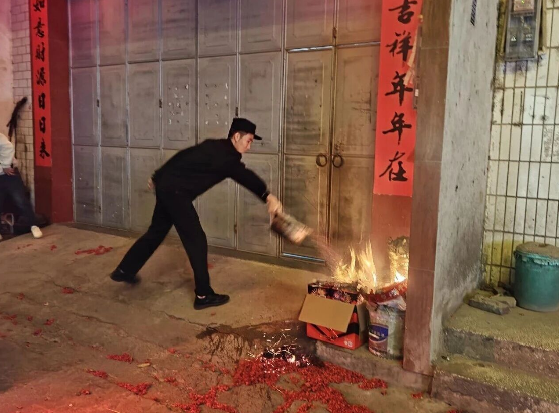 2月17日凌晨1时许,平南派出所民警在五华县河东镇平东村路口出警途中,发现一家店铺门口的烟花正在燃烧,火星四溅,存在极大的火灾隐患。