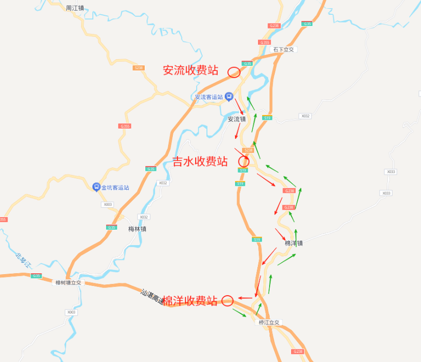 计划驶出吉水收费站的大件运输车辆、绿通车辆,梅州至汕尾方向请从安流收费站驶出,经G238国道至吉水;
