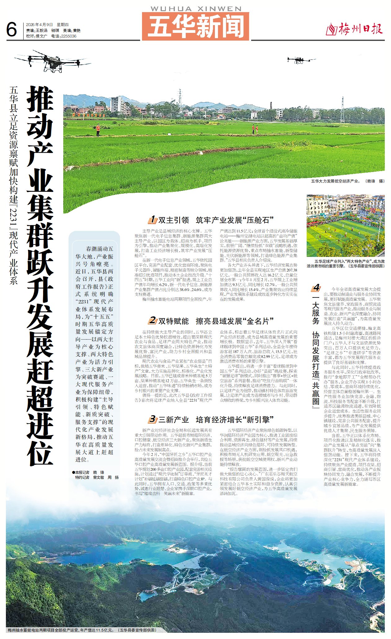 春潮涌动五华大地,产业振兴号角嘹亮。近日,五华县两会召开,县《政府工作报告》正式系统明确“2231”现代产业体系发展布局,为“十五五”时期五华高质量发展锚定方向——以两大主导产业为核心支撑、两大特色产业为活力引擎、三大新产业为突破赛道、一大现代服务产业为保障纽带,积极构建“主导引领、特色赋能、新质突破、服务支撑”的现代化产业发展新格局,推动五华在高质量发展大道上赶超进位。