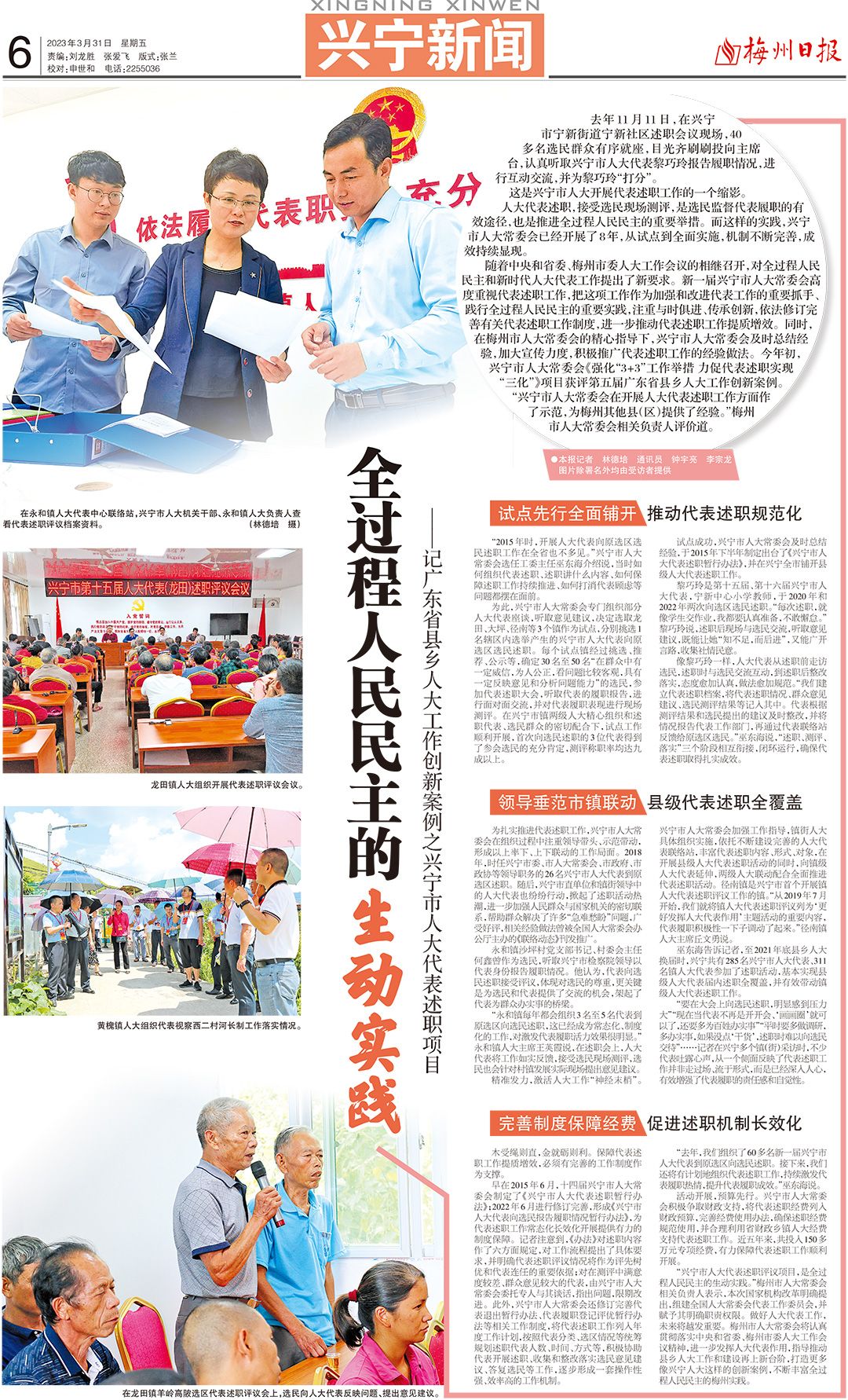 随着中央和省委、梅州市委人大工作会议的相继召开,对全过程人民民主和新时代人大代表工作提出了新要求。新一届兴宁市人大常委会高度重视代表述职工作,把这项工作作为加强和改进代表工作的重要抓手、践行全过程人民民主的重要实践,注重与时俱进、传承创新,依法修订完善有关代表述职工作制度,进一步推动代表述职工作提质增效。同时,在梅州市人大常委会的精心指导下,兴宁市人大常委会及时总结经验,加大宣传力度,积极推广代表述职工作的经验做法。今年初,兴宁市人大常委会《强化“3+3”工作举措 力促代表述职实现“三化”》项目获评第五届广东省县乡人大工作创新案例。“兴宁市人大常委会在开展人大代表述职工作方面作了示范,为梅州其他县(区)提供了经验。”梅州市人大常委会相关负责人评价道。
