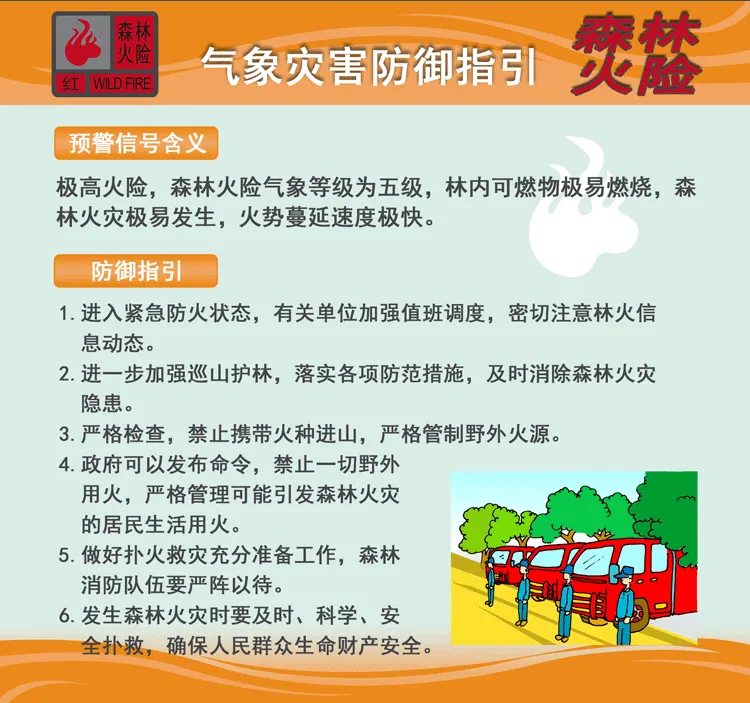 三、禁火规定:在森林防火禁火期内,气象部门预报有高温、干旱、大风等高火险天气或气象部门发布森林火险达橙色(森林火险气象等级四级以上)预警时期为森林高火险期(紧急状态),全市所有林地及距离林地边缘50米范围禁止一切野外用火,凡进入禁火区域活动的单位和个人禁止下列行为: