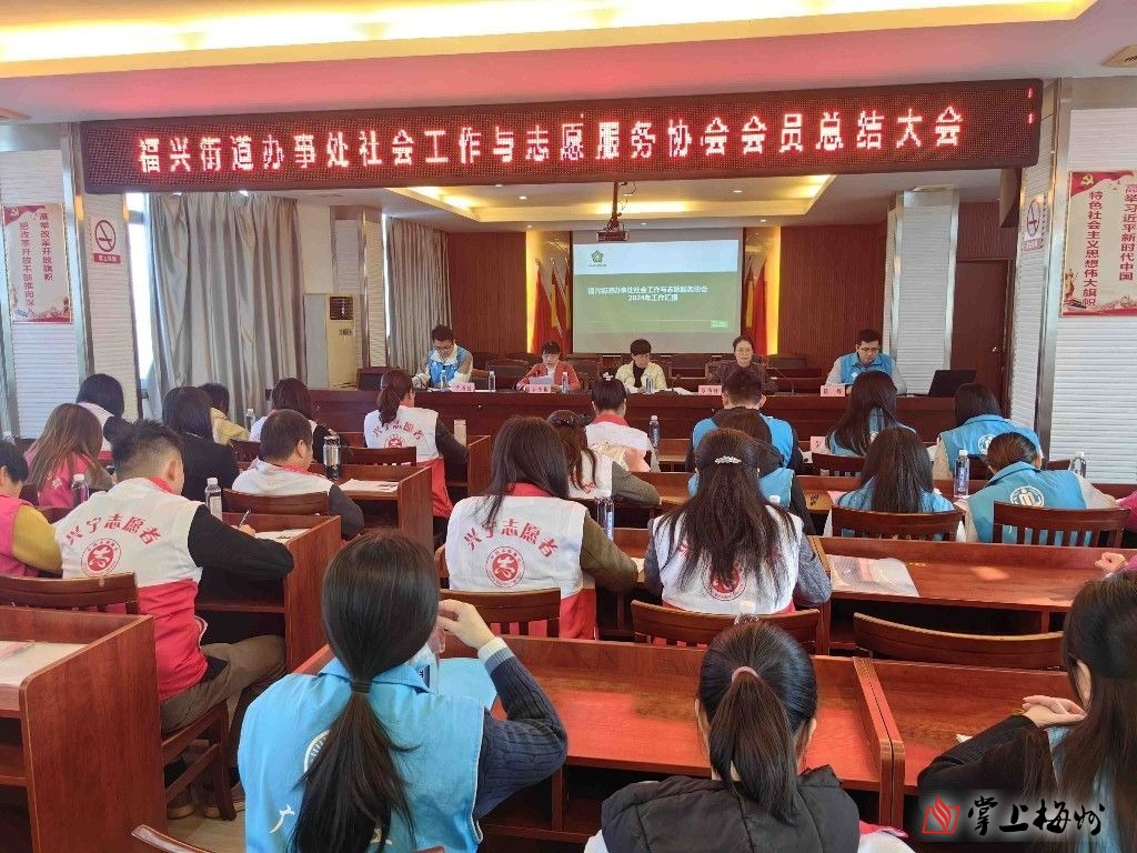 掌上梅州讯 12月27日上午,兴宁市福兴街道办事处社会工作与志愿者服务协会总结大会召开,福兴街道办事处副主任刘艳琼、妇联专职副主席罗艳红、党群服务中心主任朱冬梅、社会工作和志愿服务协会会长陈烨、副会长李圣威出席大会。