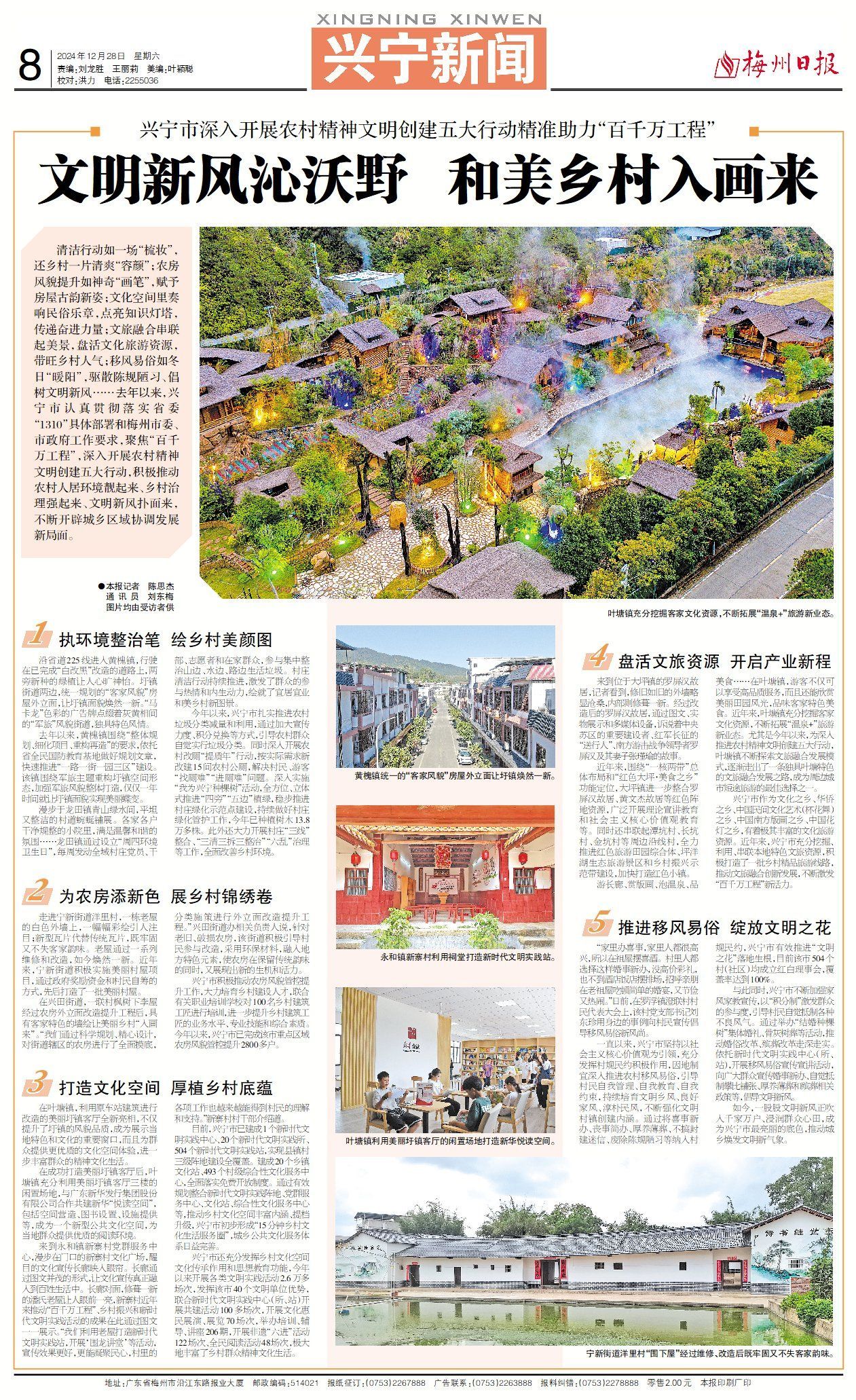 清洁行动如一场“梳妆”,还乡村一片清爽“容颜”;农房风貌提升如神奇“画笔”,赋予房屋古韵新姿;文化空间里奏响民俗乐章,点亮知识灯塔,传递奋进力量;文旅融合串联起美景,盘活文化旅游资源,带旺乡村人气;移风易俗如冬日“暖阳”,驱散陈规陋习、倡树文明新风……去年以来,兴宁市认真贯彻落实省委“1310”具体部署和梅州市委、市政府工作要求,聚焦“百千万工程”,深入开展农村精神文明创建五大行动,积极推动农村人居环境靓起来、乡村治理强起来、文明新风扑面来,不断开辟城乡区域协调发展新局面。