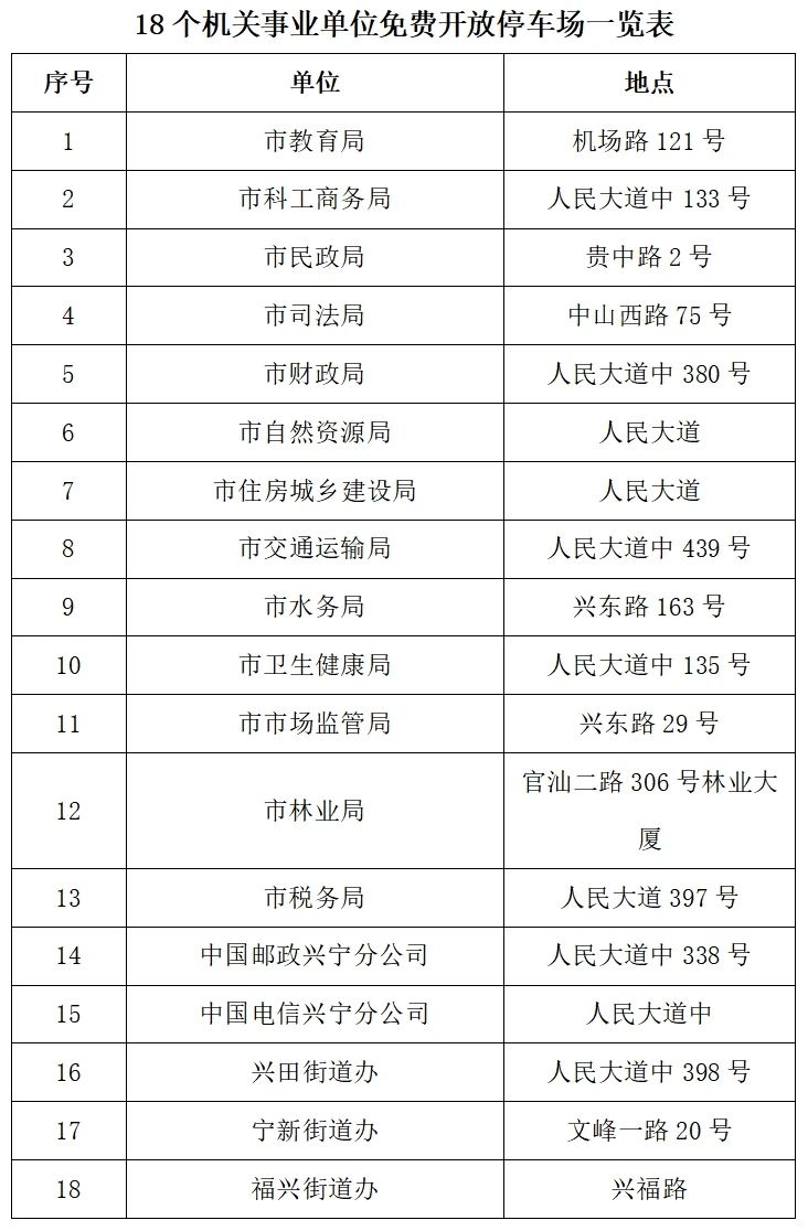 为有效缓解春节期间城区交通拥堵情况,减轻停车压力,倡导文明交通,保障节日期间良好有序的交通出行环境,让市民、回兴乡亲及来兴游客过一个文明、和谐、愉快的新春佳节,兴宁市人民政府决定从2025年1月28日(农历腊月二十九)至2月4日(农历正月初七)开放如下城区单位停车场供广大市民朋友临时停泊车辆: