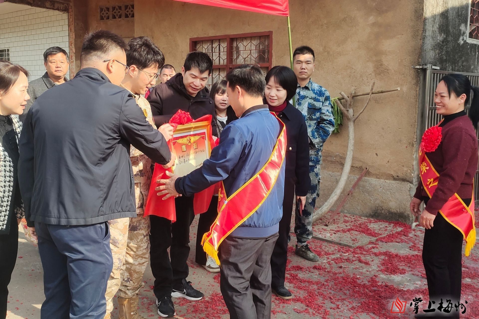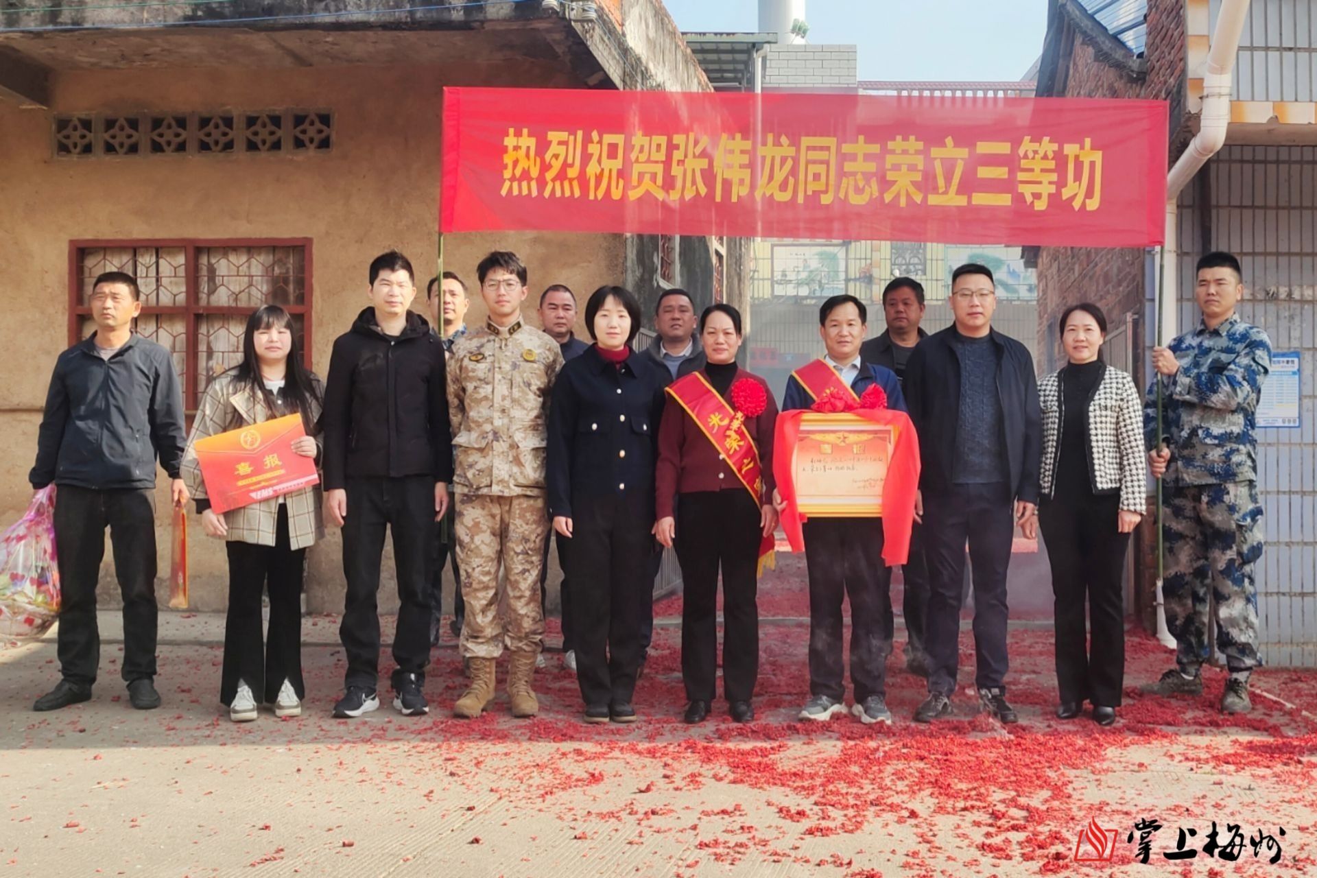 掌上梅州讯 2025年伊始,兴宁市永和镇现役军人张伟龙家中迎来喜事——因其在2024年度军分区比武竞赛中表现突出,被部队授予三等功。为弘扬军人荣誉、传递党和政府的关怀,近日兴宁市人武部、兴宁市退役军人事务局、永和镇党委政府等单位负责同志前往张伟龙家中,送去立功喜报及慰问金,对他在部队取得的优异成绩表示祝贺。