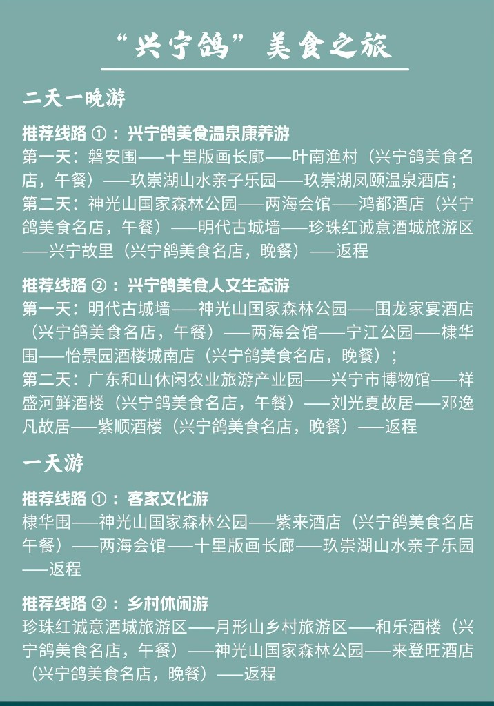 此外,地图中还标记了“兴宁鸽”美食之旅推荐路线。包括两天一晚游的兴宁鸽美食温泉康养游、兴宁鸽美食人文生态游,以及一天游的客家文化游、乡村休闲游推荐路线,为大家提供详尽的旅游参考。
