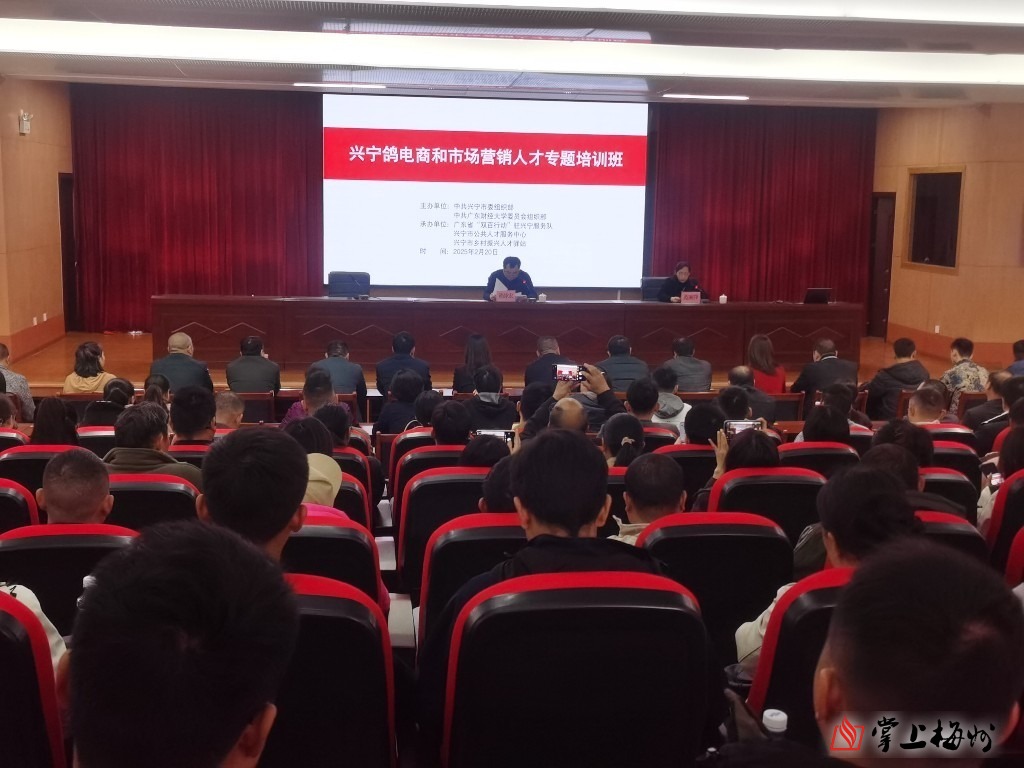 培训班由中共兴宁市委组织部、中共广东财经大学委员会组织部主办,广东省“双百行动”驻兴宁服务队、兴宁市公共人才服务中心、兴宁市乡村振兴人才驿站承办。兴宁市肉鸽协会成员和各镇(街道)村电子商务服务站点、电商企业、物流企业等负责人近200人参加,培训时间为期一天。
