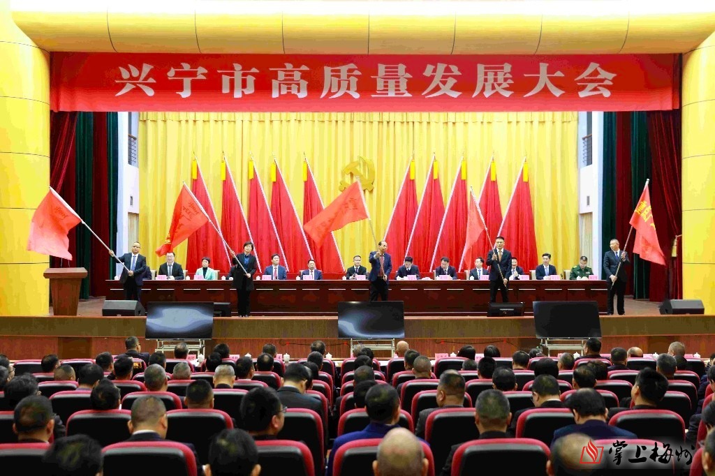 会议学习贯彻了全省、梅州市高质量发展大会精神,播放了兴宁高质量发展成效展示短片,总结部署兴宁市实体经济高质量发展及现代化产业体系建设、“百千万工程”、招商引资有关工作。部分镇(街道)、市直有关单位主要负责同志和企业经营者代表作表态发言;会议还表彰了兴宁市2024年度经济突出贡献企业,举行了重点产业攻坚队牵头单位扛旗仪式。