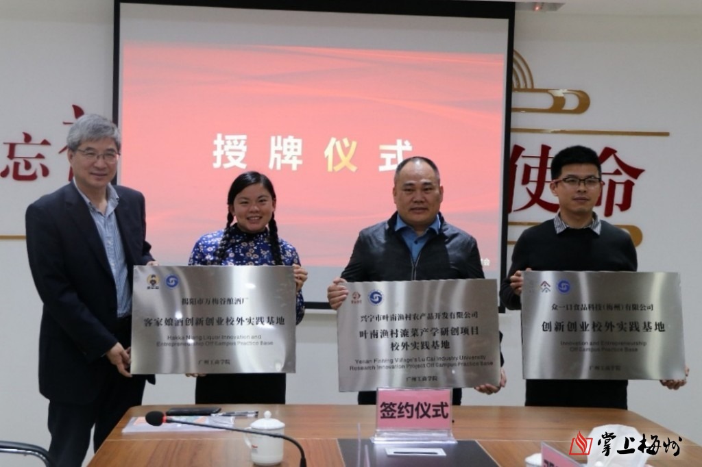 广州工商学院副教授陈伟、岭南师范学院谢鹏博士与兴宁市叶南渔村农产品开发有限公司董事长余彦雄签署了产学研创合作协议,标志着校企合作进一步深化。在授牌环节,广州工商学院创新创业教育学院为兴宁市叶南渔村农产品开发有限公司、众一口食品科技(梅州)有限公司、揭阳市万梅谷酿酒厂、惠来县溪西镇正恒食品加工厂等企业分别授予“漉菜产学研创项目校外实践基地” “创新创业校外实践基地” “萝卜干产业高质量发展共建项目”“创新创业校外实践基地”牌匾,推动教育链、科技链、人才链、产业链深度融合。