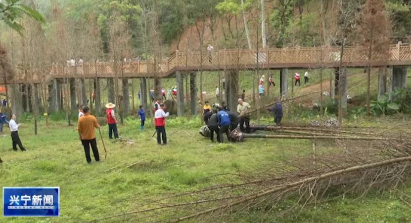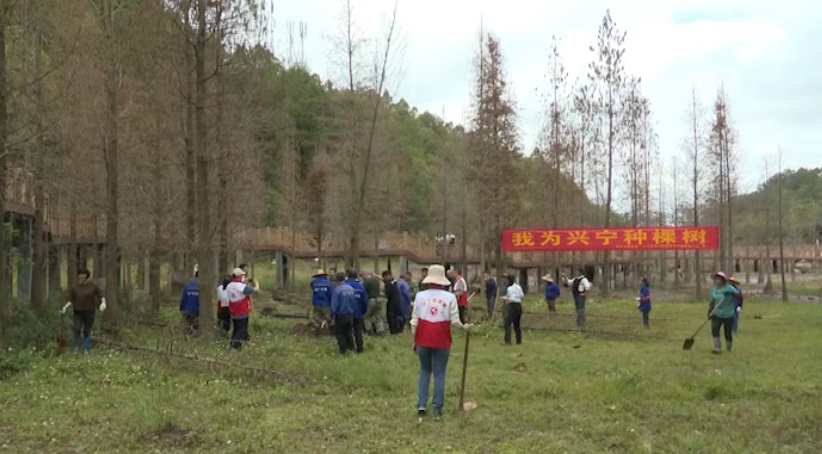 是日上午,神光山景区内春和景明,兴宁市林业局干部职工手拿锄头、铁锹,来到南山湖植树点,开展植树活动。他们三人一组,五人一队,分工协作,抬起苗木,放进树穴,扶苗、培土、加固,把一株株正在萌发的水杉种到了指定地点。活动中,兴宁市林业局干部职工还现场进行了扫码,踊跃为“我为兴宁种棵树”活动捐款。