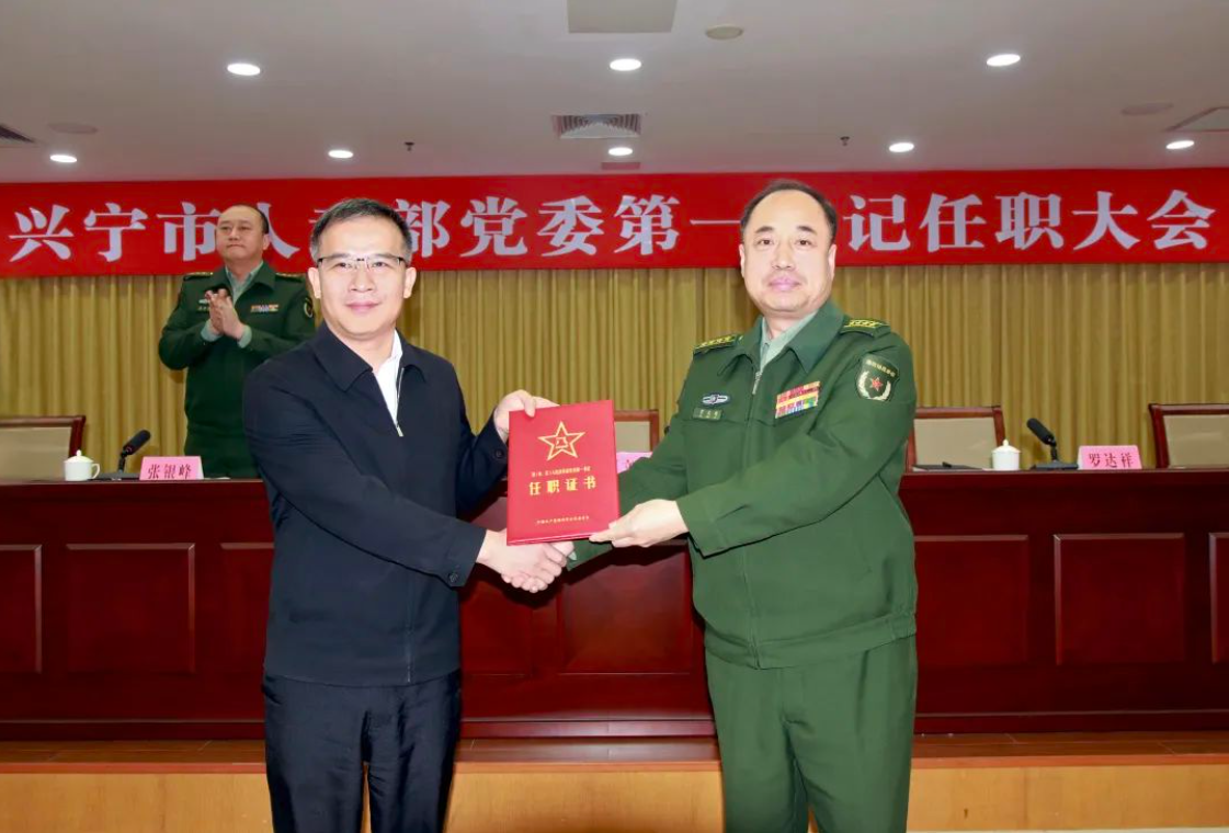 3月12日,兴宁市人武部党委第一书记任职大会在市会展中心召开,梅州市委常委、军分区大校政治委员贾文进宣布了兴宁市委书记罗达祥担任兴宁市人武部党委第一书记的决定,并颁发《任职证书》。兴宁市委常委、市人武部部长陈定鼎主持会议。