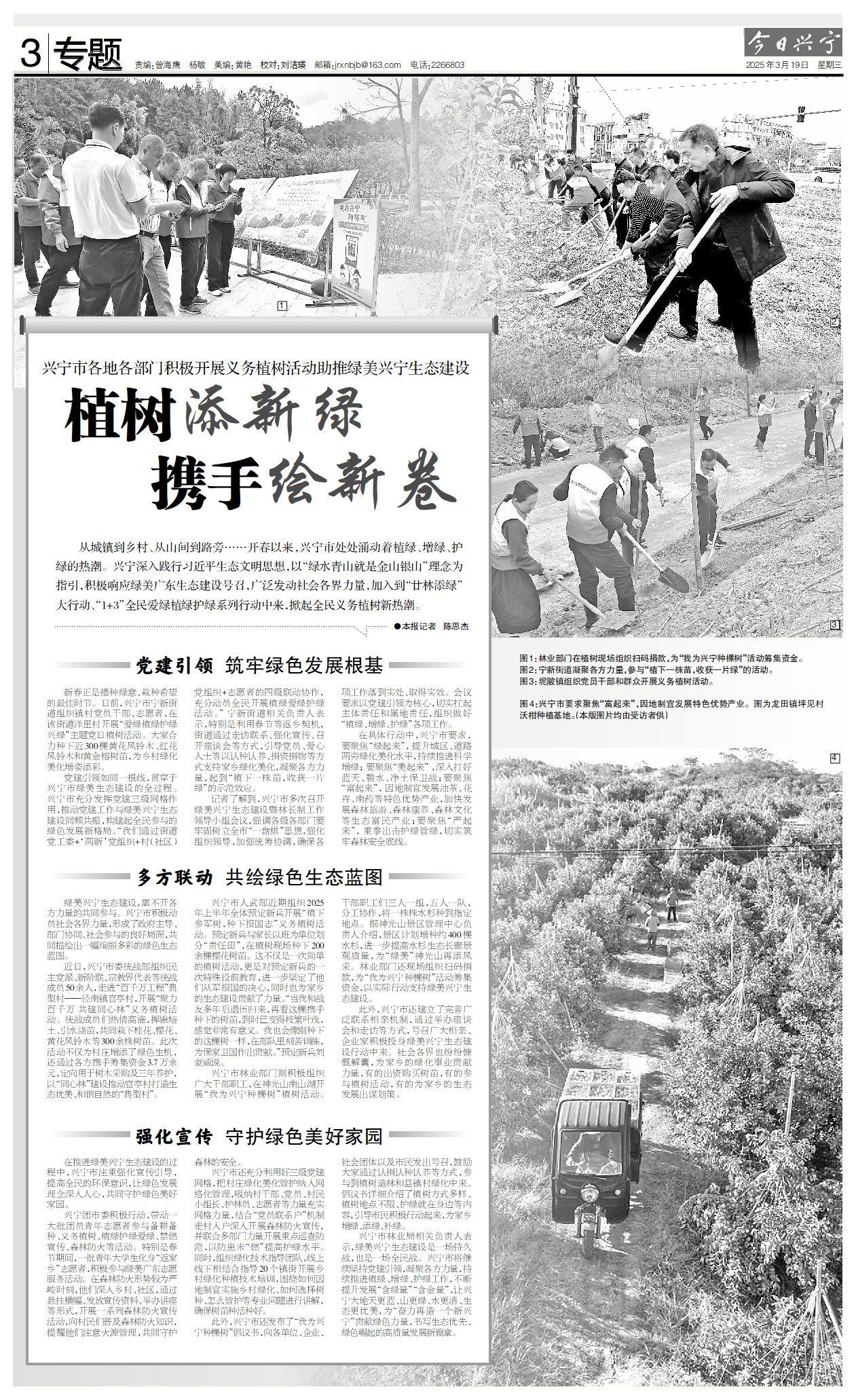 从城镇到乡村、从山间到路旁……开春以来,兴宁市处处涌动着植绿、增绿、护绿的热潮。兴宁深入践行习近平生态文明思想,以“绿水青山就是金山银山”理念为指引,积极响应绿美广东生态建设号召,广泛发动社会各界力量,加入到“廿林添绿”大行动、“1+3”全民爱绿植绿护绿系列行动中来,掀起全民义务植树新热潮。