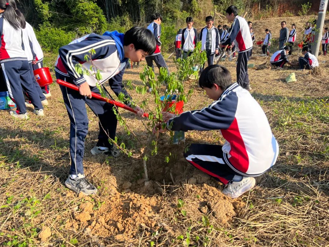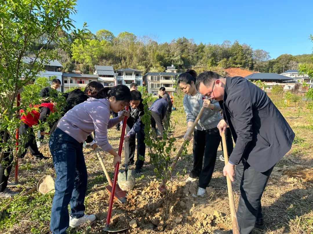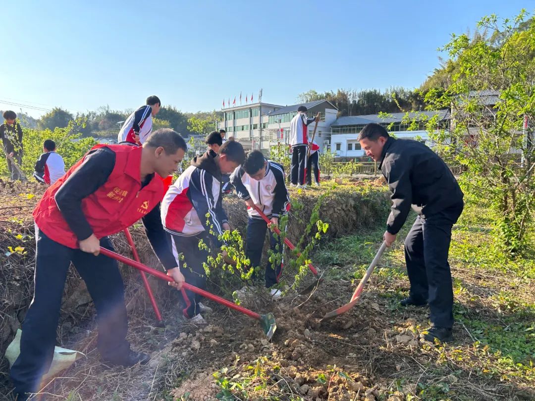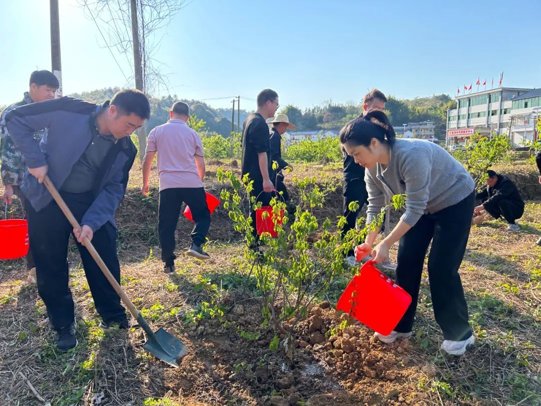种植现场,党员、团员和青年志愿者们自由分组,默契配合,井然有序地挥锹铲土、扶苗填坑、浇水灌溉,每一道工序都严格遵循“三埋两踩一提苗”的科学植树方法,动作娴熟、衔接流畅。经过一下午的不懈努力与辛勤付出,400株新栽的李树苗在这片土地上稳稳扎根。