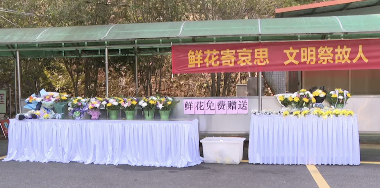 在兴宁市殡仪馆通道处,工作人员搭设了“鲜花换纸钱”活动公益服务点,为市民免费提供鲜花。不少市民纷纷响应,将携带的香烛纸钱兑换成素雅的鲜花,以更生态的方式寄托哀思。