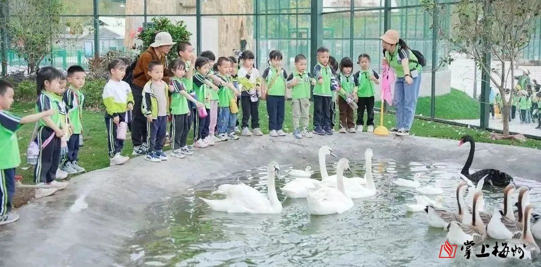 孩子们在玖崇湖山水亲子乐园参加研学,近距离接触各类动物。(兴宁文旅体局供)