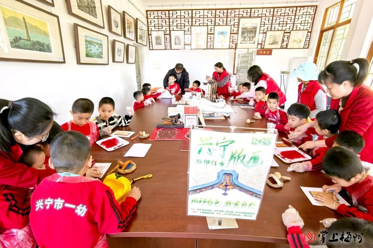 今年3月,兴宁市文化馆、兴宁市版画家协会、兴宁市第一幼儿园联合举办“版印春色·游赏自然”主题拓印打卡活动。其以“艺术+自然”的创新形式,吸引两百多名师生、家长参与。孩子们走进叶塘镇十里版画长廊,聆听讲解员讲述兴宁版画的历史,感受非遗艺术的深厚底蕴。随后,在版画传承人和版画家协会理事的指导下,孩子们亲手体验刻刀、油墨与纸张的碰撞,创作出独一无二的“春色版画”。寓教于乐的方式,激发了孩子们对传统文化的兴趣。