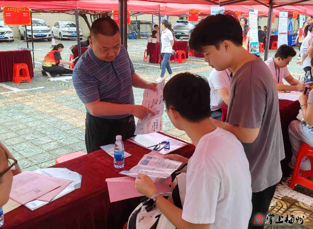 在招聘会现场,用人单位积极与毕业生沟通交流,介绍医院概况、岗位需求等情况,深入了解学生就业意愿、期望要求等。兴宁市乡村振兴人才驿站工作人员为毕业生们全方位解读了“免费梅州”和人才落户奖相关政策,并提供职业指导。