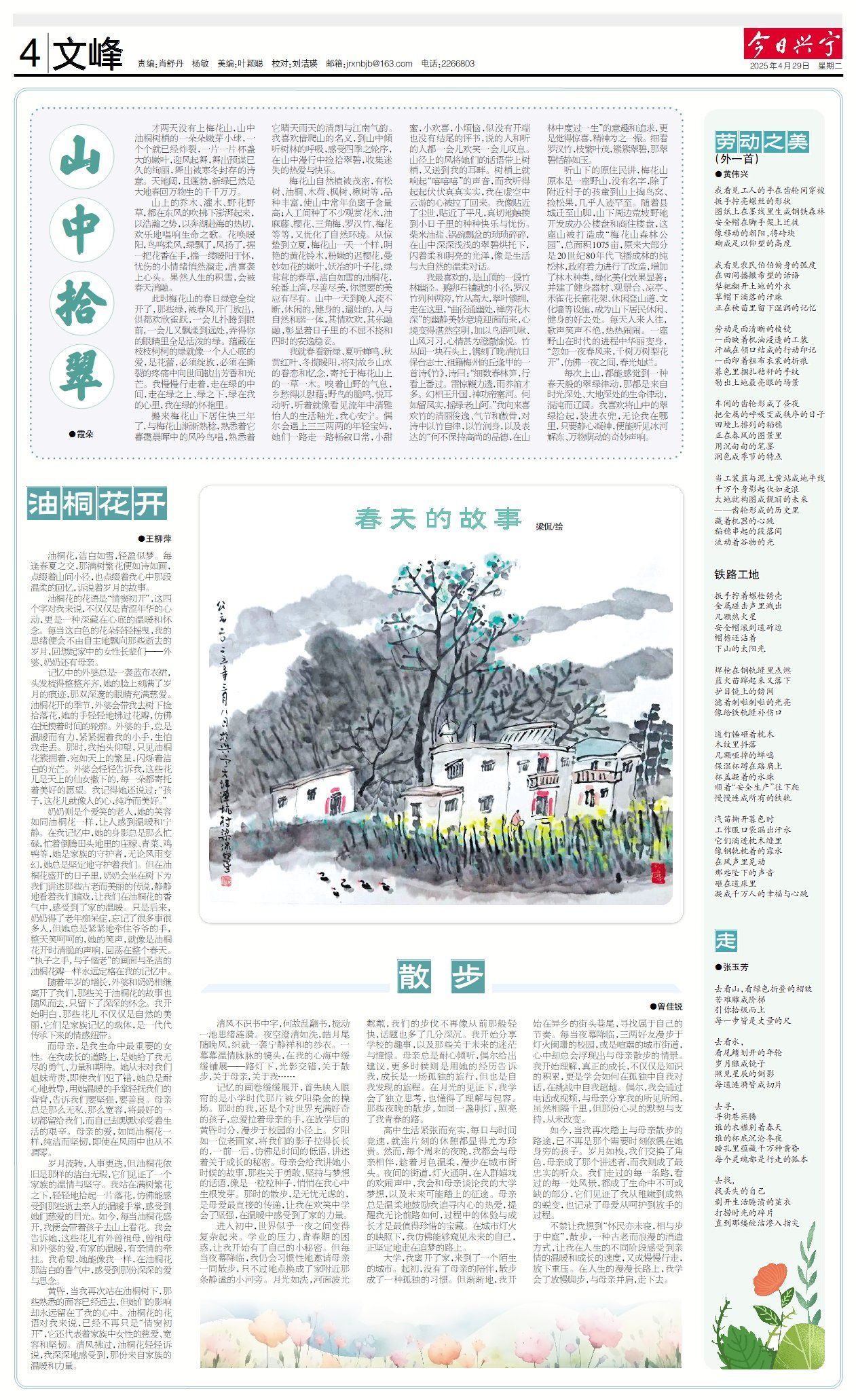 我就春看新绿、夏听蝉鸣、秋赏红叶、冬揽暖阳,将对故乡山水的眷恋和忆念,寄托于梅花山上的一草一木。嗅着山野的气息,乡愁得以慰藉;野鸟的脆鸣,悦耳动听,听着就像看见流年中清雅怡人的生活釉光,我心安宁。偶尔会遇上三三两两的年轻宝妈,她们一路走一路畅叙日常,小甜蜜,小欢喜,小烦恼,似没有开端也没有结尾的评书,说的人和听的人都一会儿欢笑一会儿叹息。山径上的风将她们的话语带上树梢,又送到我的耳畔。树梢上就响起“嘻嘻嘻”的声音,而我听得起起伏伏真真实实,我在虚空中云游的心被拉了回来。我像贴近了尘世,贴近了平凡,真切地触摸到小日子里的种种快乐与忧伤。柴米油盐、锅碗瓢盆的琐琐碎碎,在山中深深浅浅的翠碧烘托下,闪着柔和明亮的光泽,像是生活与大自然的温柔对话。