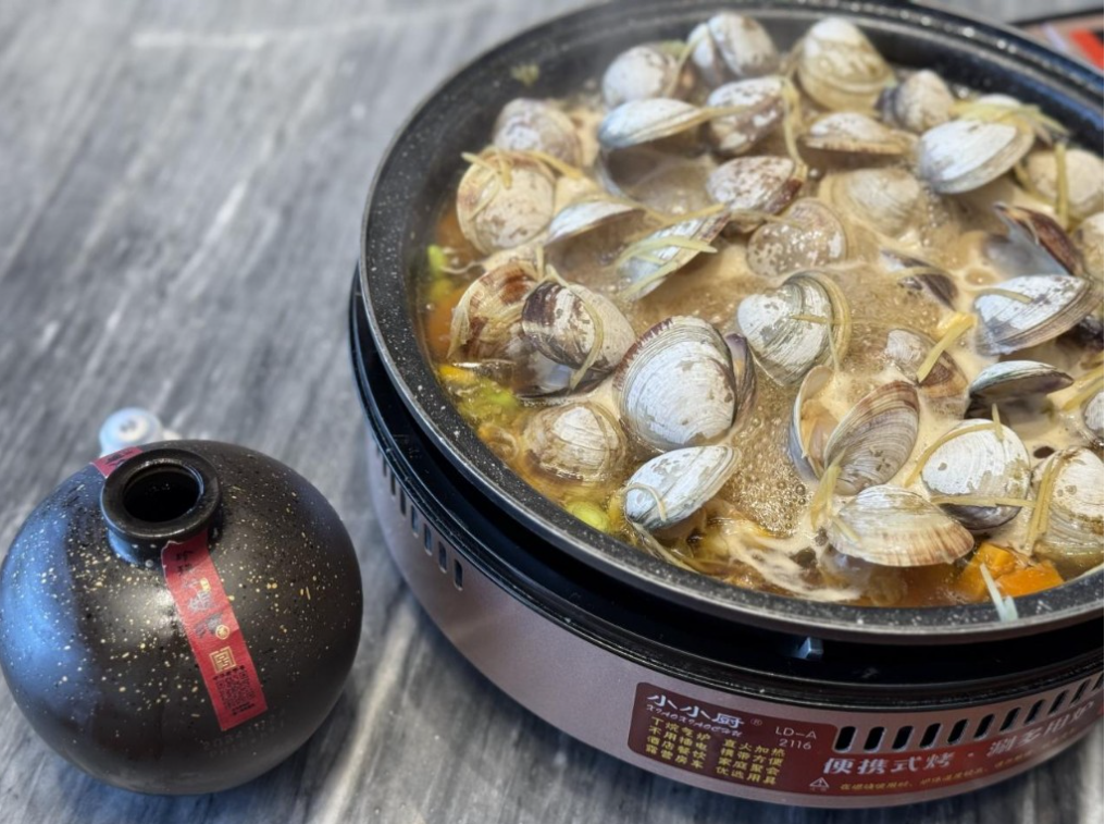 珍珠红烧酒煮沙白:以珍珠红烧酒烹煮沙白,开盖酒香扑鼻,沙白浸透醇厚酒香,鲜甜加倍。一锅盛满传统酒文化的热烈与自然的鲜甜。