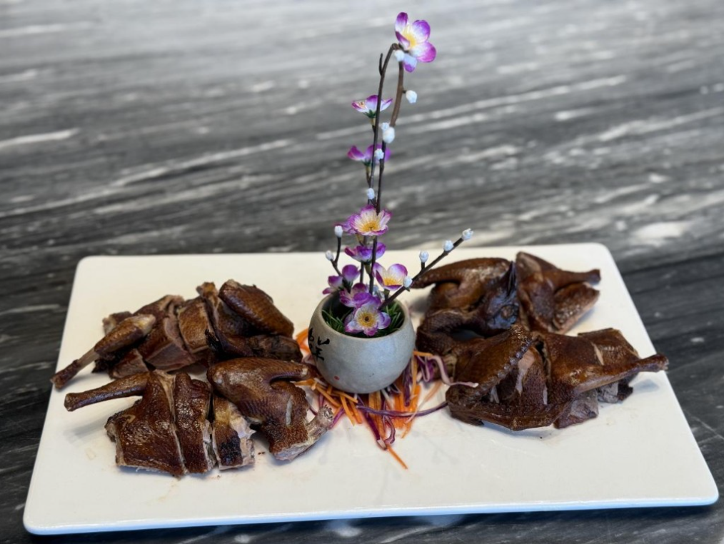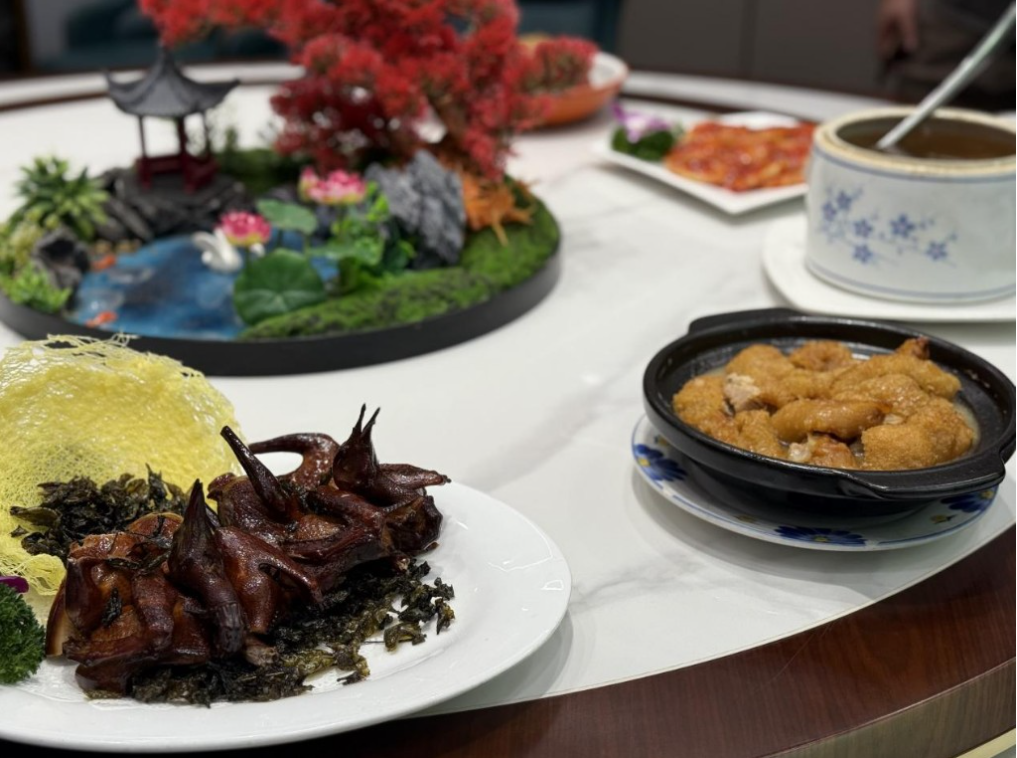 茶皇乳鸽:兴宁单丛茶高温焗制乳鸽,茶香酥脆外皮锁住肉汁,撕开瞬间茶韵回甘,山水入味,唇齿留香,是茶宴江湖的极致鲜嫩。