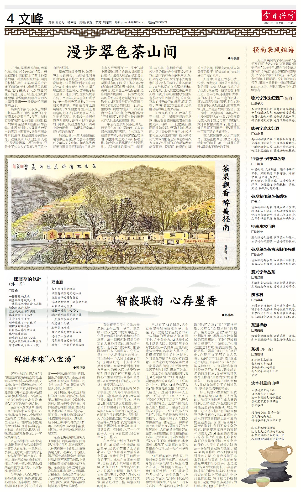 为全景展现兴宁市径南镇“百千万工程”成效,打造“茶果飘香·醉美径南”文旅特色,提升“兴宁单丛茶”和“珍珠红”酒品牌宣传和影响力,兴宁市文联策划推出一系列亮点纷呈的主题活动。宁江诗社响应号召,组织社员共赴一场茶香酒韵的山水之约。现选登部分诗作,以飨读者。