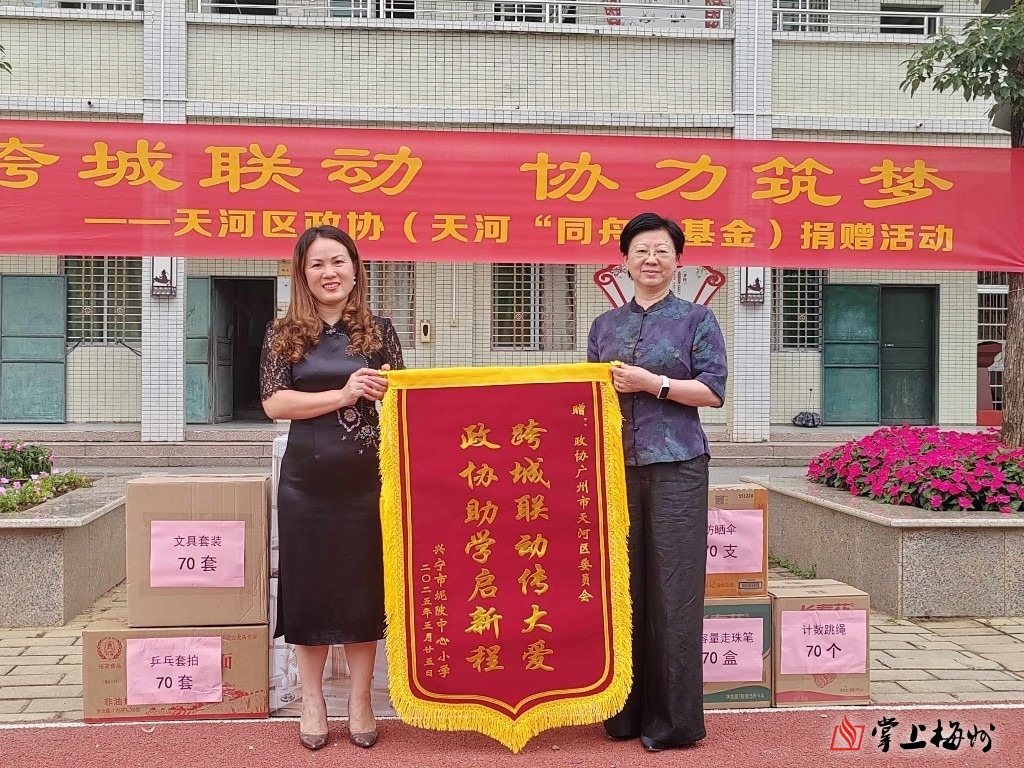 随后,坭陂中心小学党支部书记张浪静代表学校向天河区政协送上锦旗,锦旗上“跨城联动传大爱,政协助学启新程”十四大字熠熠生辉,表达了学校全体师生对天河区政协领导及爱心人士的深深感激之情。活动中曹利元一行还看望了驻坭陂镇帮扶工作队的队员们,她勉励全体队员要继续发扬天河优良传统,深入贯彻落实乡村振兴战略、“百千万工程”部署,发挥好天河作用,发挥好桥梁纽带作用,助力兴宁坭陂高质量发展。